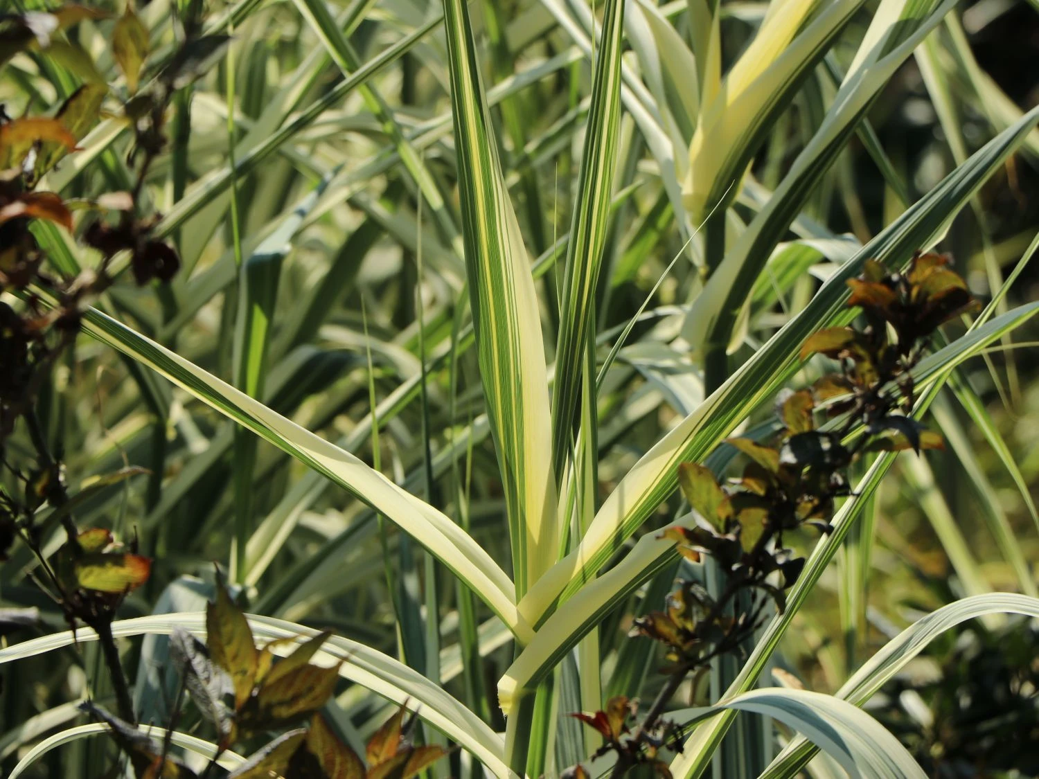 Die zart braunen Blüten von Arundo donax ‚Variegata‘ sind rispenartig angeordnet, wobei die Einzelblüte unscheinbar wirkt. Die unbehaarten Blätter sind in ihrer Form schmal, langgezogen und mit eng anliegender Blattscheide. Das Buntblättrige Pfahlrohr ‚Variegata‘ zeichnet sich durch die Zweifarbigkeit seines Laubes aus. Der grün-weiße Kontrast verleiht der bis zu drei Meter hohen Pflanze noch mehr Grazilität. Dieses schöne Gras wächst zu einer beeindruckenden und imposanten Schönheit heran. Allerdings benötigt sie einen ausreichenden Platz zur Ausbreitung. Das Buntblättrige Pfahlrohr ‚Variegata‘ erreicht eine Höhe von bis zu drei Metern und einen Durchmesser von bis zu 250 Zentimetern. Der optimale Abstand von einer Pflanze zur nächsten beträgt 150 bis 250 Zentimeter. Grundsätzlich ist Arundo donax ‚Variegata‘ winterhart. Sinken die Temperaturen auf unter -12° C, ist eine schützende Unterstützung erforderlich. Die langen Schilfstängel, die nach dem Absterben der oberirdischen Pflanzenteile zum Herbst hin zurückbleiben, schützen den Wurzelbereich der Pflanze. Der Rückschnitt erfolgt im Frühjahr. Der Wurzelstock treibt erneut aus und die frischen grünen Triebe streben zügig dem Himmel entgegen. Junge, neu angepflanzte Gräser schützt der sorgsame Gärtner in den ersten Jahren mit einer zusätzlichen Laubschicht oder Mulchdecke vor Frost. Die jungen Pflanzen sind noch deutlich empfindlicher als langjährige Gartenbewohner.