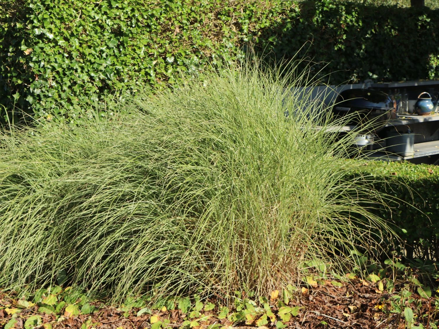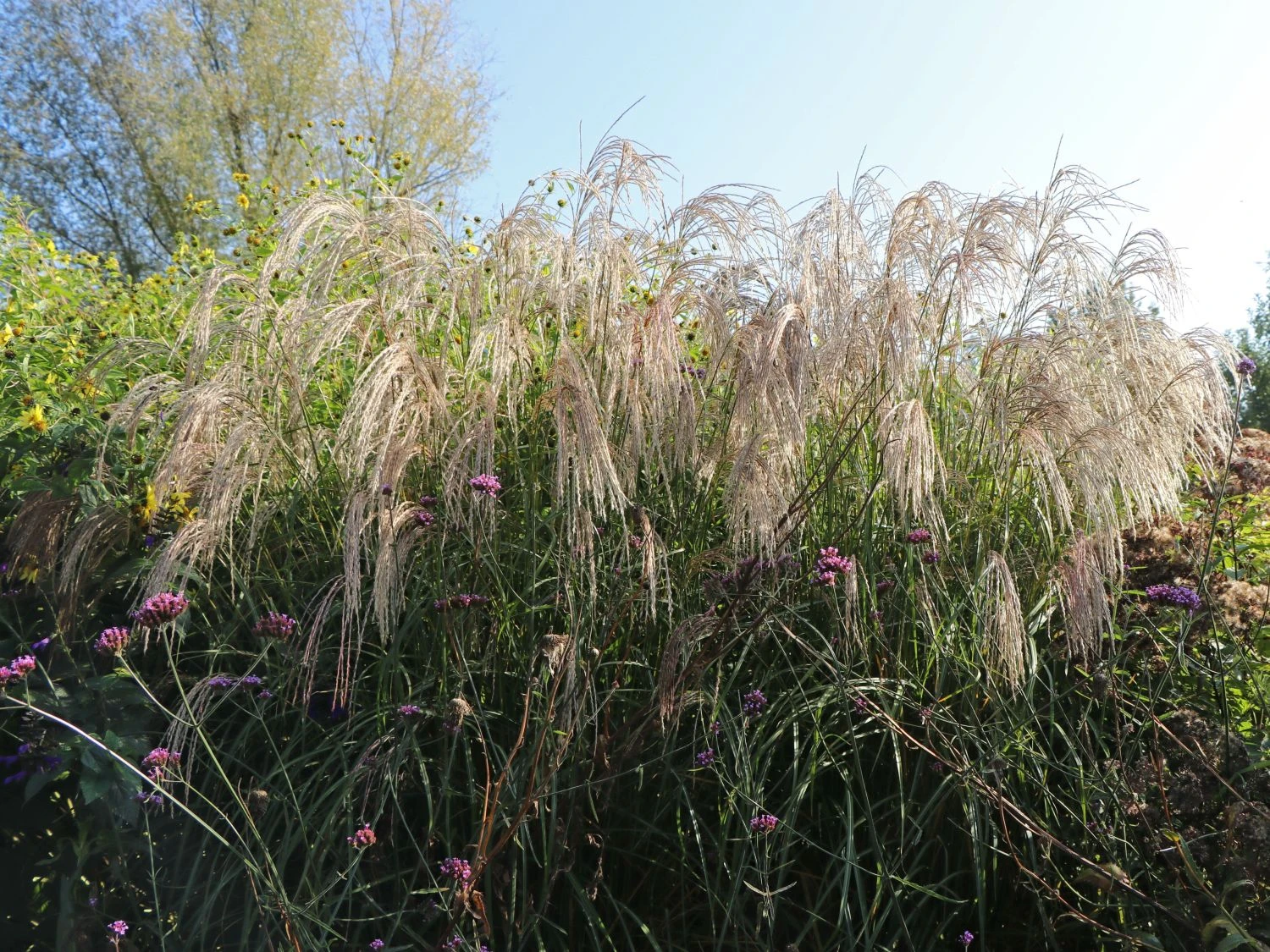 Auch im Winter bietet das Das Chinaschilf ‚Morning Light‘ einen schönen Anblick. Wenn sich Reif an den Halmen sammelt, entsteht eine beinahe kontemplative Szenerie. Daher ist es ratsam, den Rückschnitt erst im Frühjahr vorzunehmen. Das hat den weiteren Vorteil, dass die Halme das Herz der Pflanze vor Winternässe schützen. Der Gärtner bindet dafür den Schopf von Miscanthus sinensis ‚Morning Light‘ zusammen. Im ersten Winter brauchen die Pflanzen dieser Sorte noch etwas Schutz, beispielsweise mit Tannenzweigen oder Vlies. Später ist das Chinaschilf ‚Morning Light‘ gut winterhart. Das Ziergras gedeiht wunderbar auf durchlässigem und nährstoffreichem Boden und zeigt dort einen guten Wuchs und erweist sich als ausgesprochen langlebig. Sonnige Standorte eignen sich optimal für die Pflanze. Als strukturgebende Staude eignet sich dieses Schilf in der Gartengestaltung beispielsweise als mittelhohe Hecke oder als Sichtschutz. Die großen Horste des Chinaschilfs ‚Morning Light‘ wirken zudem sehr beruhigend und eignen sich aus diesem Grunde auch bestens als Randbepflanzung für einen Sitzplatz zum Entspannen im Gartenbereich.