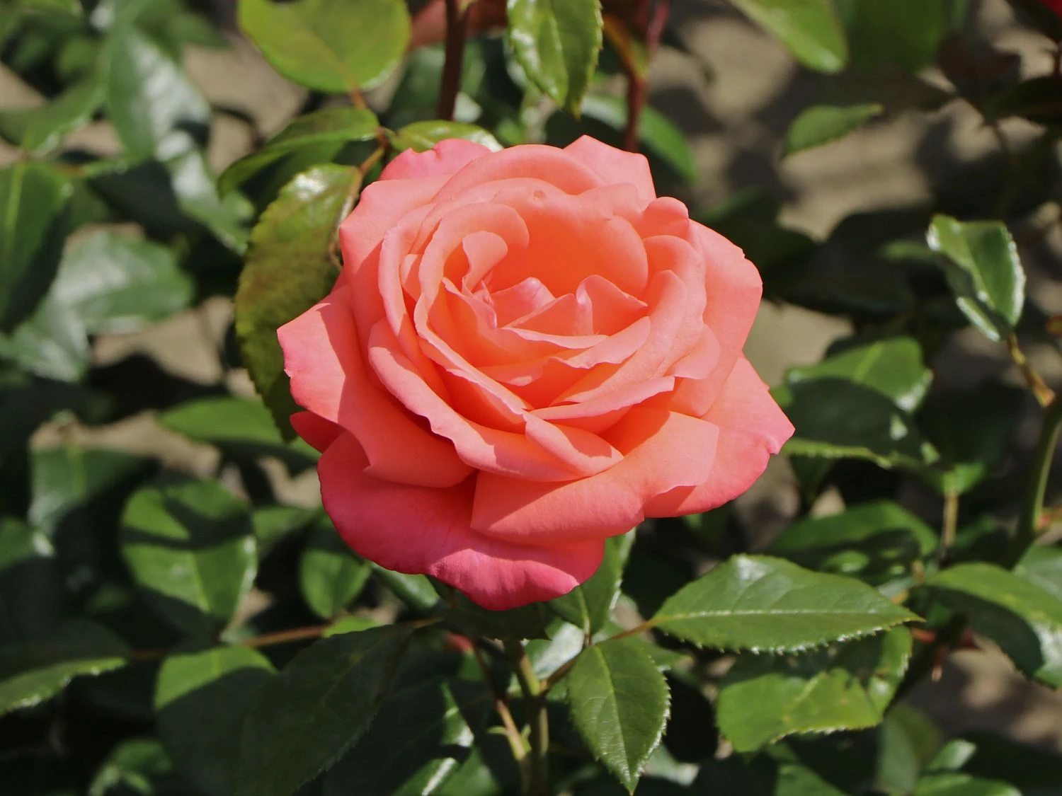 Die Edelrose ‚Focus‘ ® besticht durch das romantische Farbenspiel der Blüten. Von Juni bis September leuchten die mittelgroßen, gefüllten Blüten in zartem Apricot, Orange und Rosa. Voll erblüht werden die gelben Staubgefäße sichtbar. Das dunkelgrüne, glänzende Laub von (bot.) Rosa ‚Focus‘ ® setzt sich kontraststark von den hellen, leuchtenden Blüten ab. Das Laub der Edelrose ‚Focus‘ ® ist gefiedert, besitzt einen gesägten Rand, sowie eine gute Blattgesundheit.