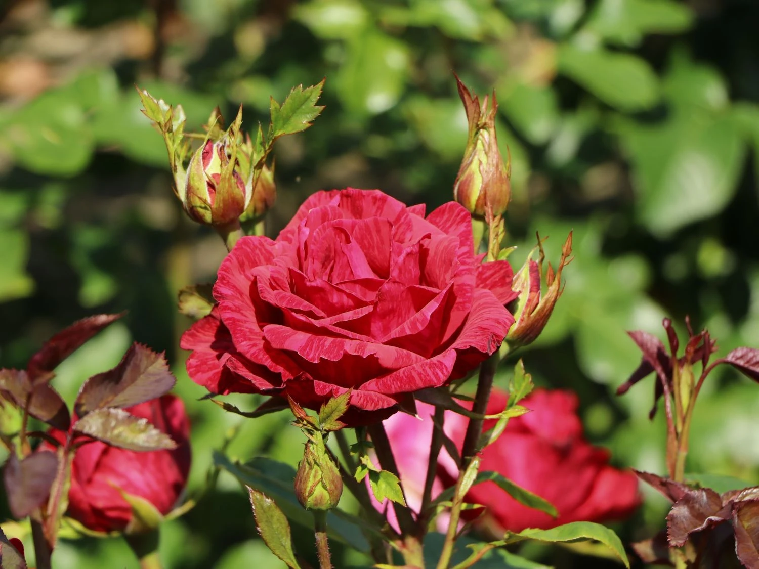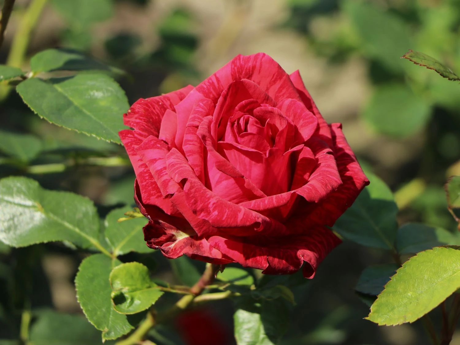 Die Edelrose ‚Red Intuition‘ ® sorgt im Garten für eine prachtvolle Attraktion. Außergewöhnlich gefärbte Blüten überraschen das Auge und ein dezent-zarter Duft verführt die Nase. Jede Blüte zeigt ein individuelles Muster aus dunkelroten Streifen auf leuchtend rotem Grund. Die Blätter kontrastieren mit ihrem frischen Mittelgrün die Blütenkunstwerke der Edelrose ‚Red Intuition‘ ®. In der Vase sind die langstieligen Blüten von Rosa ‚Red Intuition‘ ® lange Zeit haltbar und eignen sich daher gut für Dekorationen und als Geschenk.
