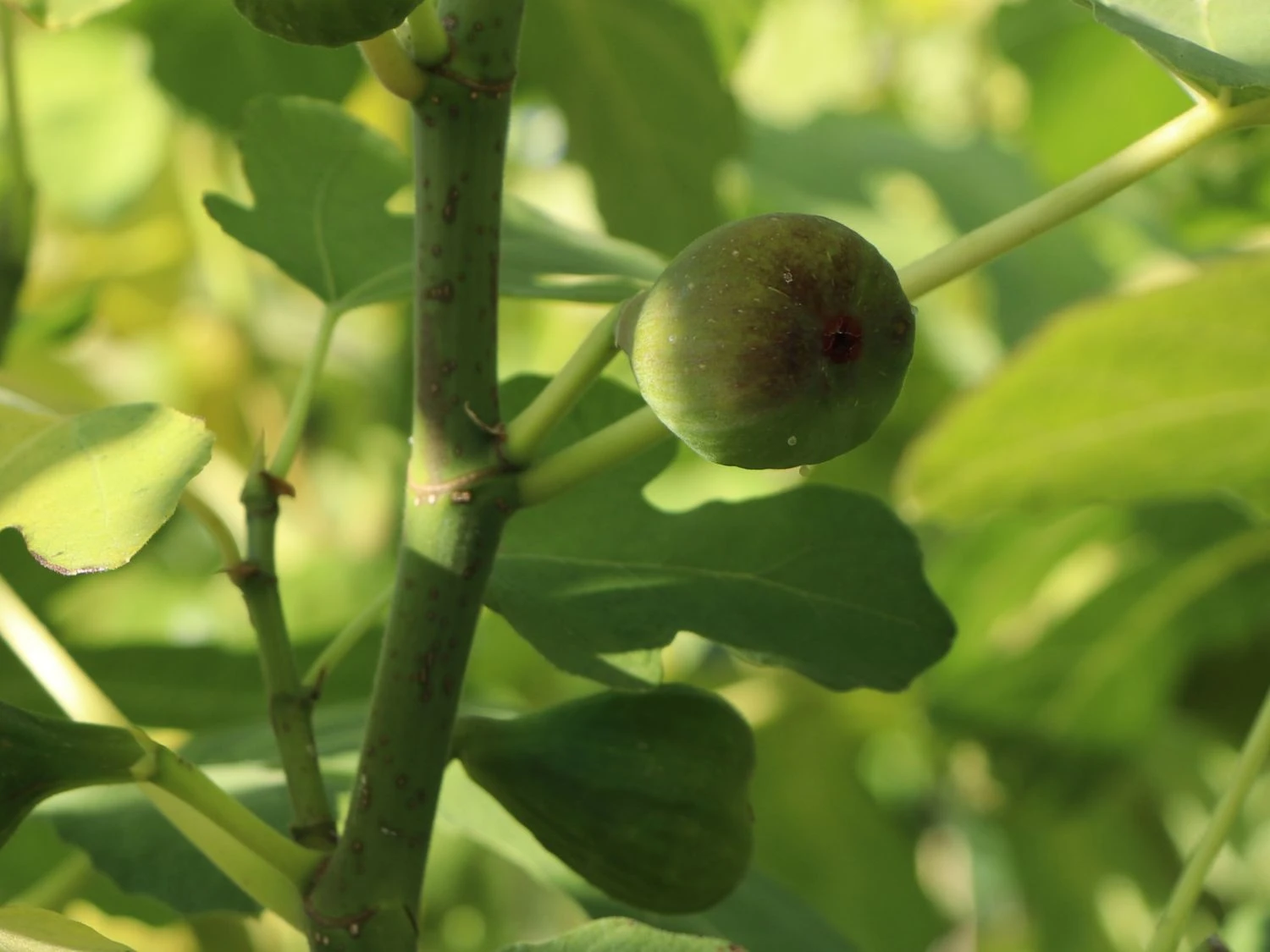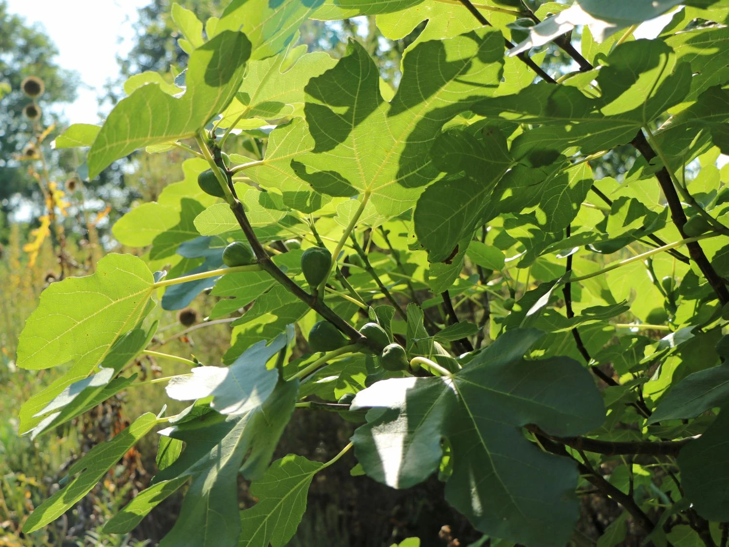 Ein ungewöhnlicher Anblick in unseren Gärten! Die Feige ‚Rouge de Bordeaux‘ ist ein wundervolles Obstgehölz, das mit einem fantastischen Wuchs, schönem Laub und köstlichen Früchten punktet. In einem frischen Grün präsentieren sich ihre attraktiven und unverkennbar gelappten Blätter. Dank ihrer einmaligen Form und Größe verleihen sie ihrem Umfeld ein südländisches Flair. Zwischen dem Laub lugen die zunächst grünen Früchte hervor, deren Farbton sich mit der Zeit in ein sattes Blauviolett verwandelt. Das granatrote Fruchtfleisch verwöhnt den Gaumen mit einer intensiven, aromatischen Süße. Robust und winterhart bis zu -15 °C überzeugt (bot.) Ficus carica ‚Rouge de Bordeaux‘ als Liebhabergehölz. Diese Feigen-Sorte wächst als dicht verzweigter Strauch, der eine Höhe von 180 bis 250 Zentimetern erreicht. In der Breite variiert das Gewächs von 60 bis 200 Zentimetern. Mit einem jährlichen Zuwachs von bis zu 20 Zentimetern wächst Ficus carica ‚Rouge de Bordeaux‘ verhältnismäßig langsam. Im Garten zieht das Gehölz als effektvoller Solitärstrauch die Blicke auf sich. Die Feige ‚Rouge de Bordeaux‘ schmückt samtige Rasenplätze und Freiflächen. Vor weißen Hauswänden und Mauern wirkt ihr üppiges Grün wunderbar kontrastierend. In mediterranen Gärten brilliert sie in Kombination mit Oleander und Olivenbäumen. Mit ihren großen, leuchtend grünen Blättern und dem dichten, ausladenden Wuchs bildet sie einen zauberhaften Kontrast zu den dunkelgrünen Nadeln der Zypresse. Im Kübel verschönert ein Exemplar dieser Sorte den Balkon und die Terrasse. Die ‚Rouge de Bordeaux‘ bildet große, dekorative Laubblätter aus, die stark gelappt wachsen. Von ihrem kräftigen Mittelgrün setzen sich die hellen Blattadern elegant ab. Die Blüte der Feige ‚Rouge de Bordeaux‘ entwickelt sich im Inneren der jungen Fruchtansätze und ist nicht sichtbar.