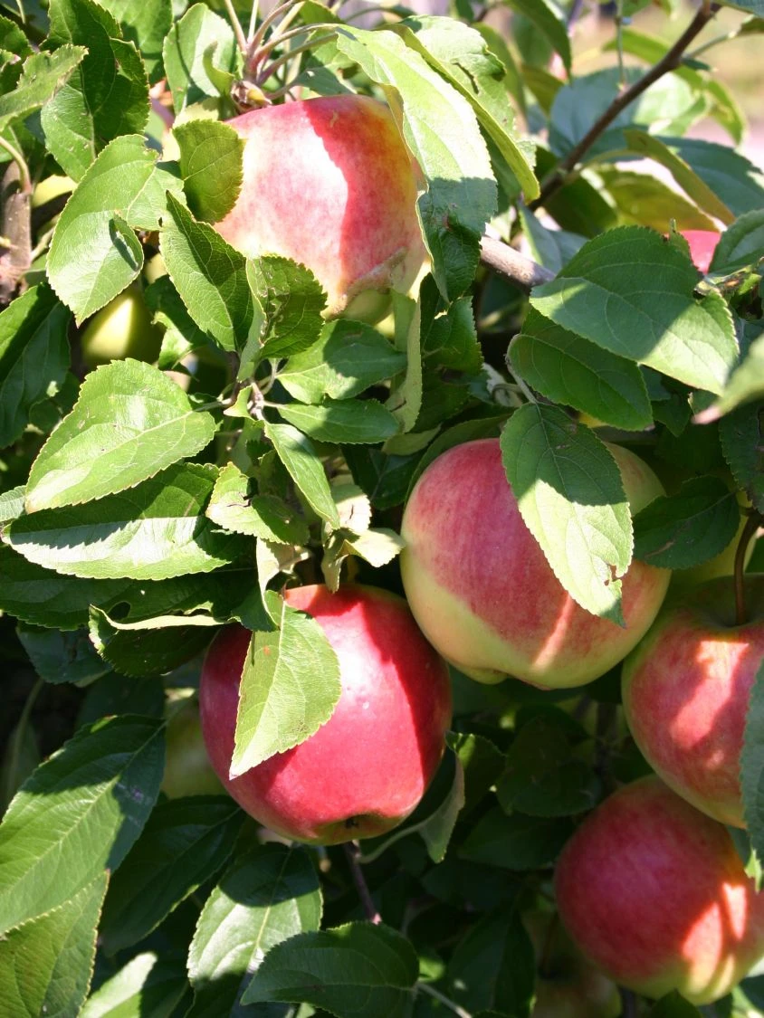 Der Herbstapfel ‚Reglindis‘ besticht mit seinen appetitlichen Früchten und dem ansprechenden Erscheinungsbild. Von Anfang September bis Oktober ist die Erntezeit für die mittelgroßen Äpfel. Diese wecken mit ihrer grüngelben und leuchtend roten Schale die Lust zum Naschen. Ihr cremegelbes, festes Fruchtfleisch ist wunderbar saftig. Es verwöhnt den Gaumen mit seinem aromatischen, süß-säuerlichen Geschmack. Das Institut für Pflanzenzüchtung in Dresden-Pillnitz entwickelte Malus ‚Reglindis‘ im Jahre 1967. Die Sorte zeichnet sich durch eine hervorragende Gesundheit aus, sie ist widerstandsfähig gegen Schorf, Mehltau und rote Spinne. Sie besitzt attraktives Laub in einem kräftigen Grün. Im Herbst erfreuen die eiförmigen Blätter das Auge mit einem leuchtenden Gelb. Der Herbstapfel ‚Reglindis‘ begeistert außerdem mit seinen bezaubernden Blüten, die von April bis Mai erscheinen. Sie schimmern in einem hellen Rosa und duften angenehm zart. Bienen, Hummeln und andere Insekten lassen sich in großer Zahl auf den Blüten nieder, um Nektar aufzunehmen.