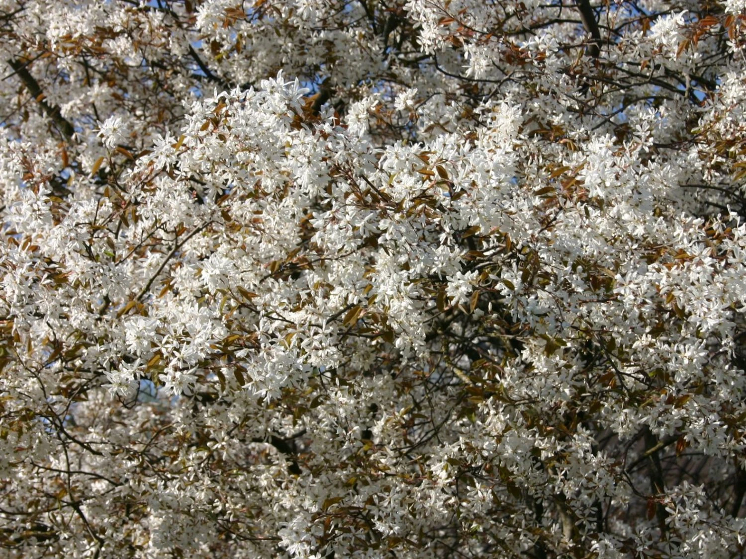 Gegen Ende April, wenn sich bereits erste kupferfarbene Blätter gezeigt haben, öffnen sich auch die Blütenknospen der Kupfer-Felsenbirne. Sie sitzen an 6- bis 12-blütigen lockeren, aufrechten und gedrungenen Trauben und jede einzelne Blüte wird bis zu 2,5 Zentimeter breit. Von ihrem Aussehen her erinnern die Blüten an fünfzackige Sterne, die wie Funken zwischen den Blättern hervorblitzen. Sie besitzen 5 weiße bis zartrosafarbene, längliche, schmale Blütenblätter, 20 gelbe Staubblätter und bis zu 14 Millimeter lange Kronblätter. Bienen, Hummeln und Schmetterlinge fühlen sich von ihnen angezogen und vervollständigen den Anblick auf magische Art und Weise. Bis in den Mai hinein kann die Blütenfülle bestaunt werden, bevor sich die Blüten langsam in Früchte verwandeln.