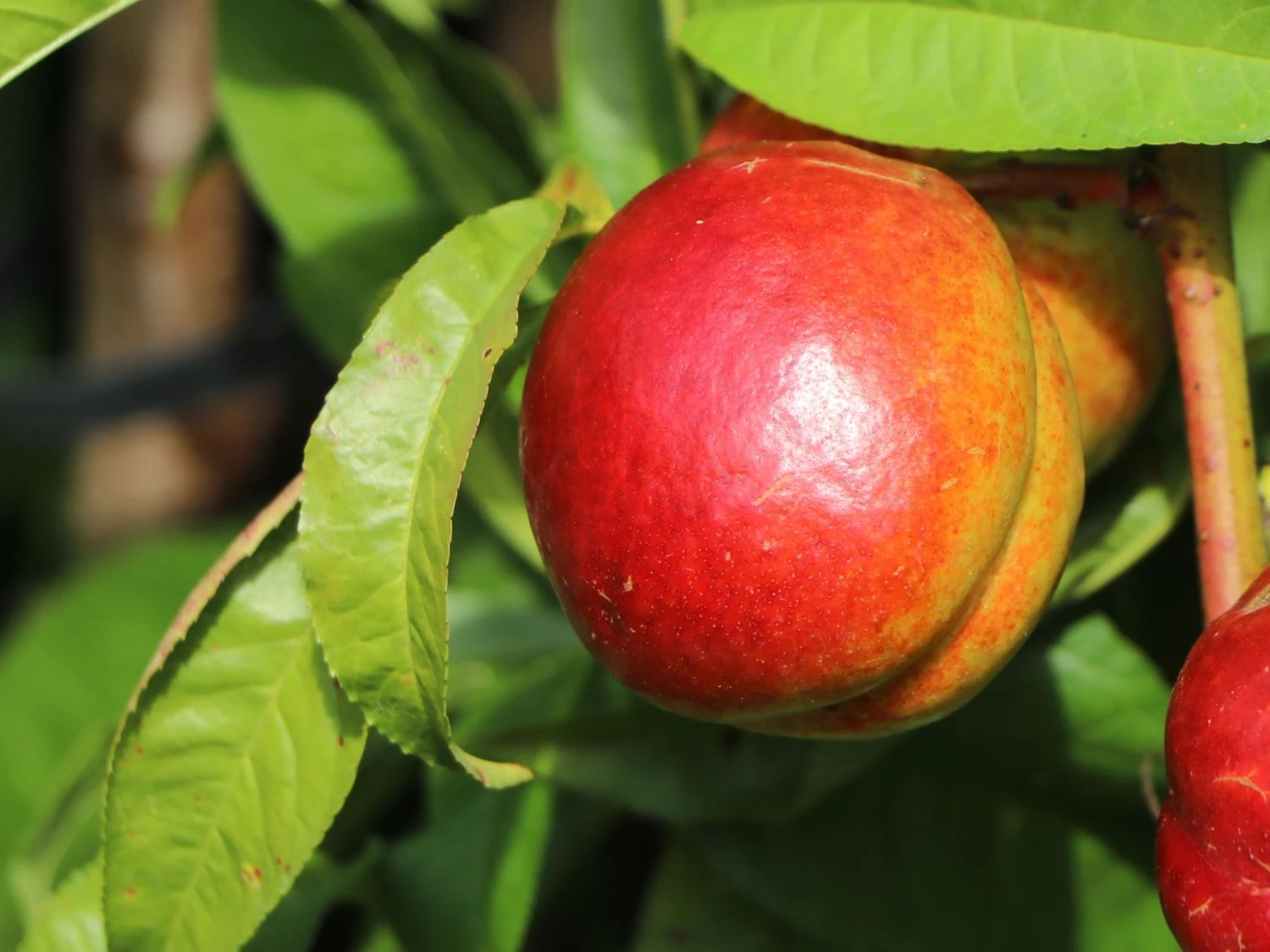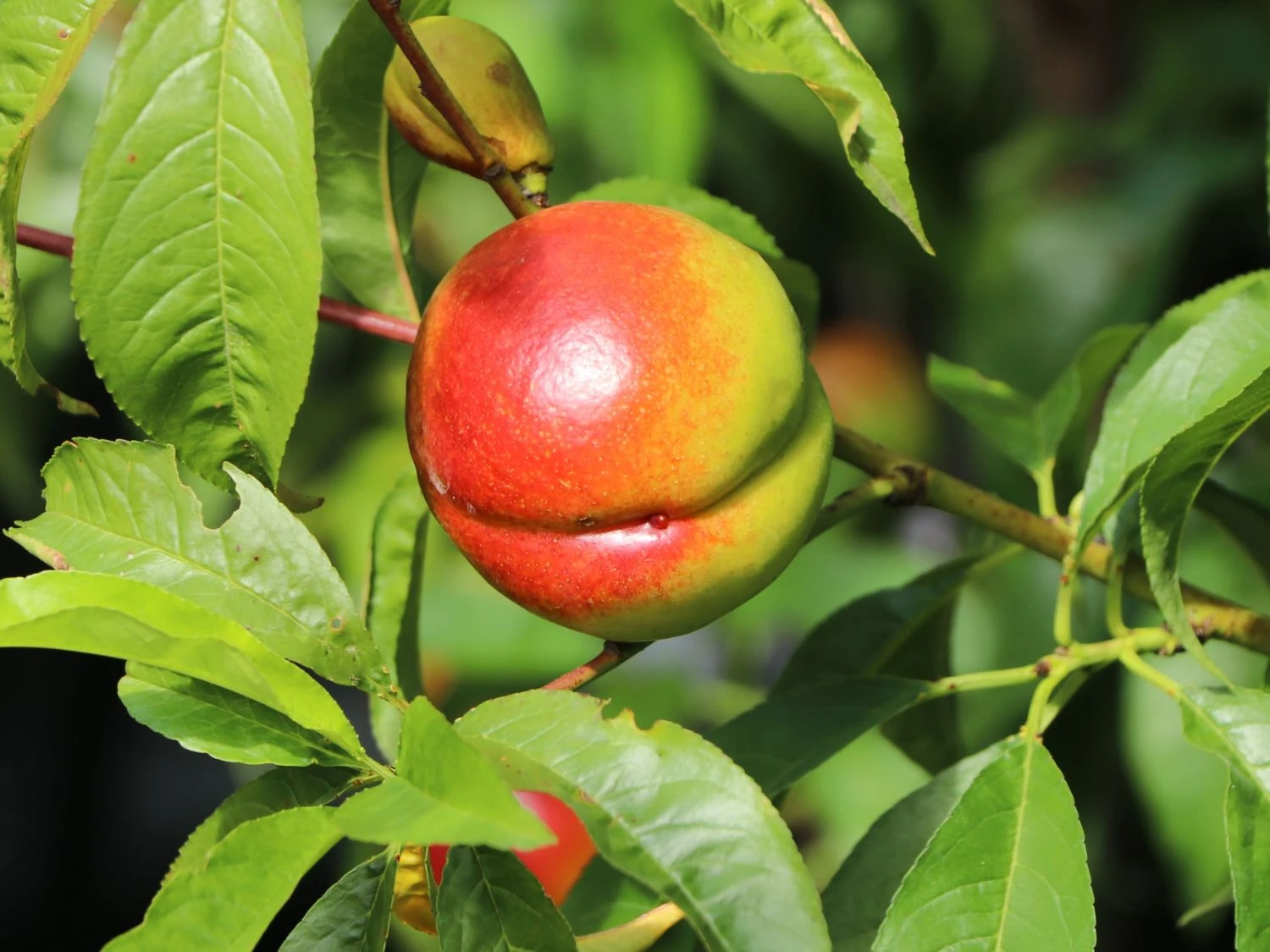 Die Nektarinen sind mittelgroß und besitzen eine wunderbare orangegelbe, sonnenseits eine rote Deckfarbe. Das Fruchtfleisch der Nektarine ‚Independence‘ ist gelb, lässt sich leicht vom Stein lösen und begeistert durch sein mildes, feines Aroma mit einer leichten säuerlichen Note. Wie saftig die Nektarine ist! Die Schale lässt sich problemlos mitessen. Am besten schmecken Nektarinen frisch. Die Früchte lassen sich für Quarkspeisen, Obstsalate, Müsli oder Kuchen verwenden oder zu Kompott verarbeiten und für Fruchtbowlen anrichten. Diese Nektarinen schmecken unglaublich köstlich und punkten durch ihren hohen Vitamin-Gehalt. Der sommergrüne Obstbaum schmückt sich mit lanzettlich geformten Blätter. Diese sind mittelgrün und glänzend. Durch regelmäßiges Ausdünnen des verzweigten Obstgewächses bilden sich größere Früchte. Der Obstbaum ist winterhart. Damit Prunus persica var. nucipersica ‚Independence‘ nicht zu trocken steht, benötigt das Obstgehölz eine regelmäßige Wässerung. Die beste Pflanzzeit für die Nektarine ist das Frühjahr oder der Herbst. Der Gärtner achtet darauf, dass das Pflanzloch groß und tief genug für den Wurzelballen ist. Die Nektarine ‚Independence‘ ist der Traum in jedem Obstgarten. Dieser liebenswerte Kleinbaum verleiht jedem Garten ein mediterranes Flair.