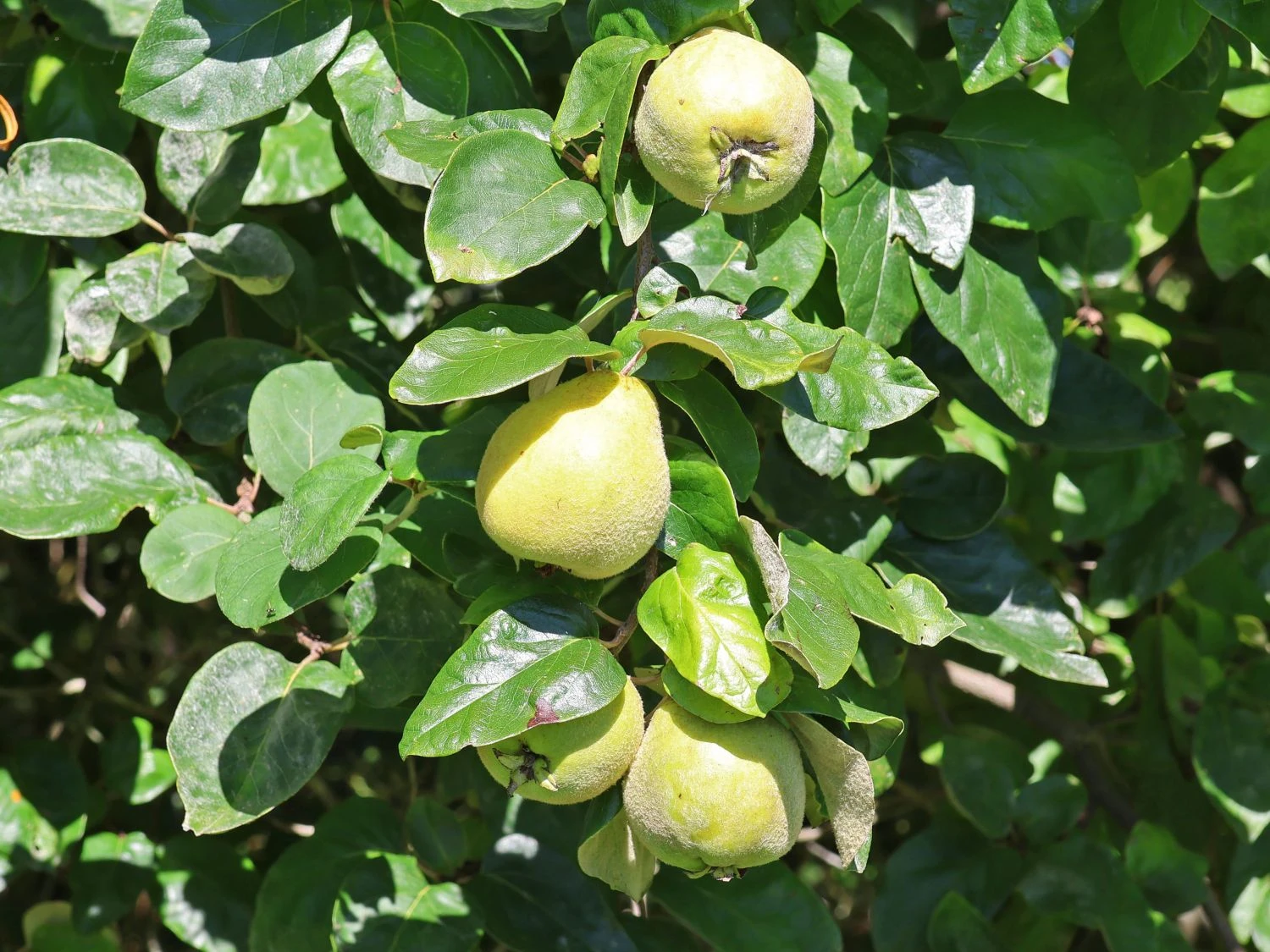 Erntezeit ist Ende Oktober. Die Früchte enthalten viel Vitamin A und bieten mit ihrem weißgelben, saftigen Fleisch in der Küche vielfältige Verwendungsmöglichkeiten. Sie haben einen süßsäuerlichen Geschmack, verströmen einen angenehmen, würzig-fruchtigen Duft und eignen sich hervorragend für Kompott, Marmeladen und Gelees sowie für Säfte und Likör. Freunde von süßen Delikatessen schätzen die Früchte als Kuchenbelag. Cydonia ‚Portugiesische‘ wächst pro Jahr rund 30 bis 50 Zentimeter. Der Baum kann bis zu fünf Meter hoch und bis zu vier Meter breit werden. Er ist üppig verzweigt und trägt große, mittelgrüne, ovale Blätter, die er im Herbst abwirft. Die beste Pflanzzeit für die Quitte ‚Portugiesische‘ ist im Frühjahr und im Herbst. Der Baum freut sich über einen sonnigen bis halbschattigen Standort mit nährstoffreichem Boden. Vorteilhaft ist ein humoser, duchlässiger Boden. Cydonia ‚Portugiesische‘ ist frosthart. Der Baum ist wärmeliebend und gedeiht an einem warmen, geschützten Standort besonders gut. Aufgrund des starken Wuchses von Cydonia ‚Portugiesische‘, ist auf ausreichend Platz zu achten, damit sich der Baum frei entfalten kann. Er kommt als Solitärpflanze auf einer Wiese oder in einem Bauerngarten mit flach wachsenden Pflanzen am besten zur Geltung. Bei geringen Niederschlägen benötigt der Baum für ein optimales Wachstum eine regelmäßige Bewässerung. Wurde die Quitte im Frühjahr gepflanzt, verlangt sie im Sommer viel Wasser. Ist der Baum gut eingewurzelt, ist eine zusätzliche Bewässerung lediglich bei extremer Trockenheit ratsam. Am richtigen Standort werden Liebhaber seltener Obstsorten lange Freude an der Quitte ‚Portugiesische‘ haben. Sie ist robust und widerstandsfähig. Es handelt sich bei Cydonia ‚Portugiesische‘ um eine alte Kultursorte der Birnenquitte.