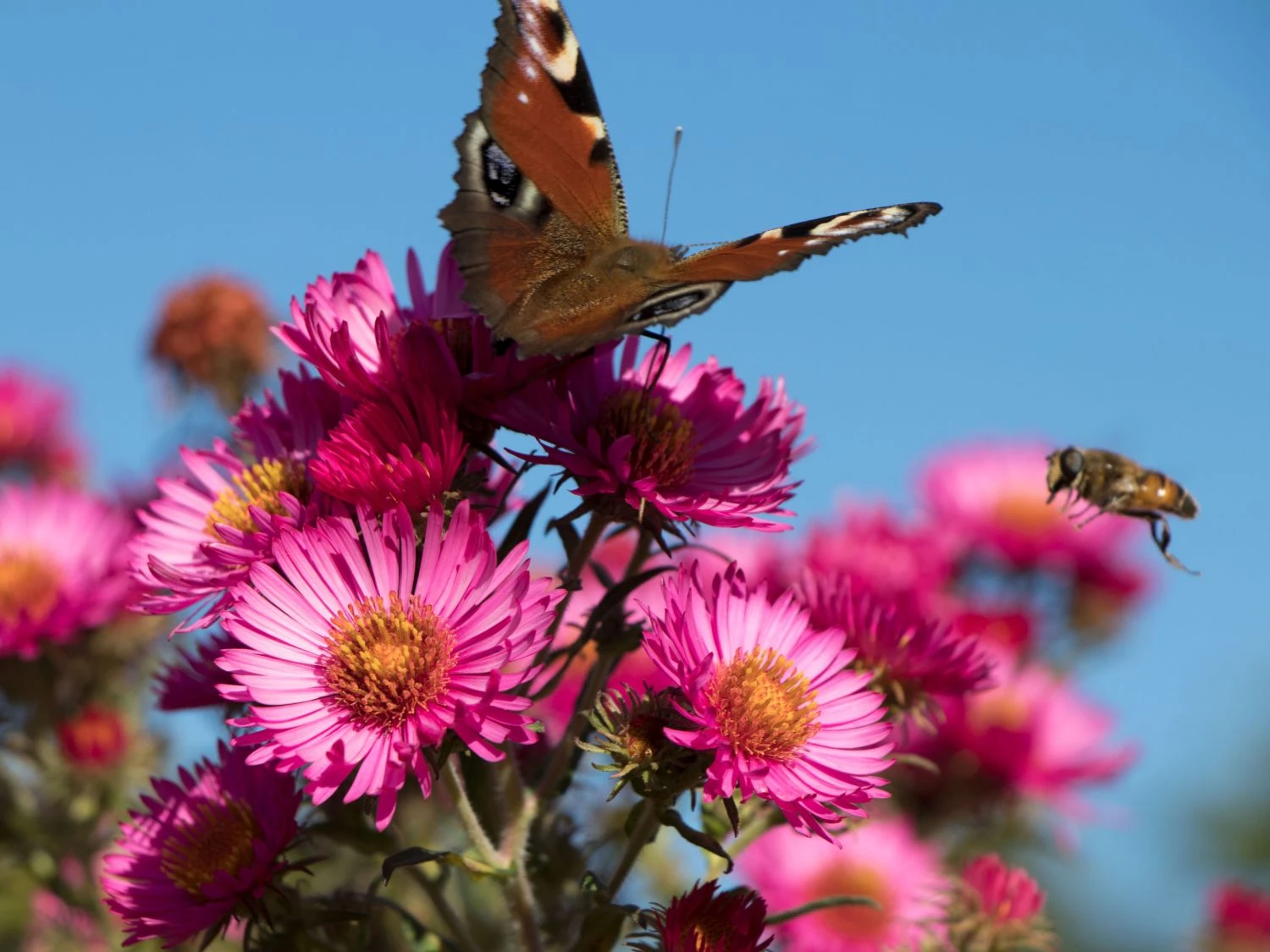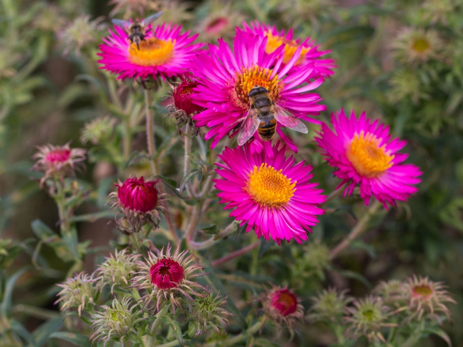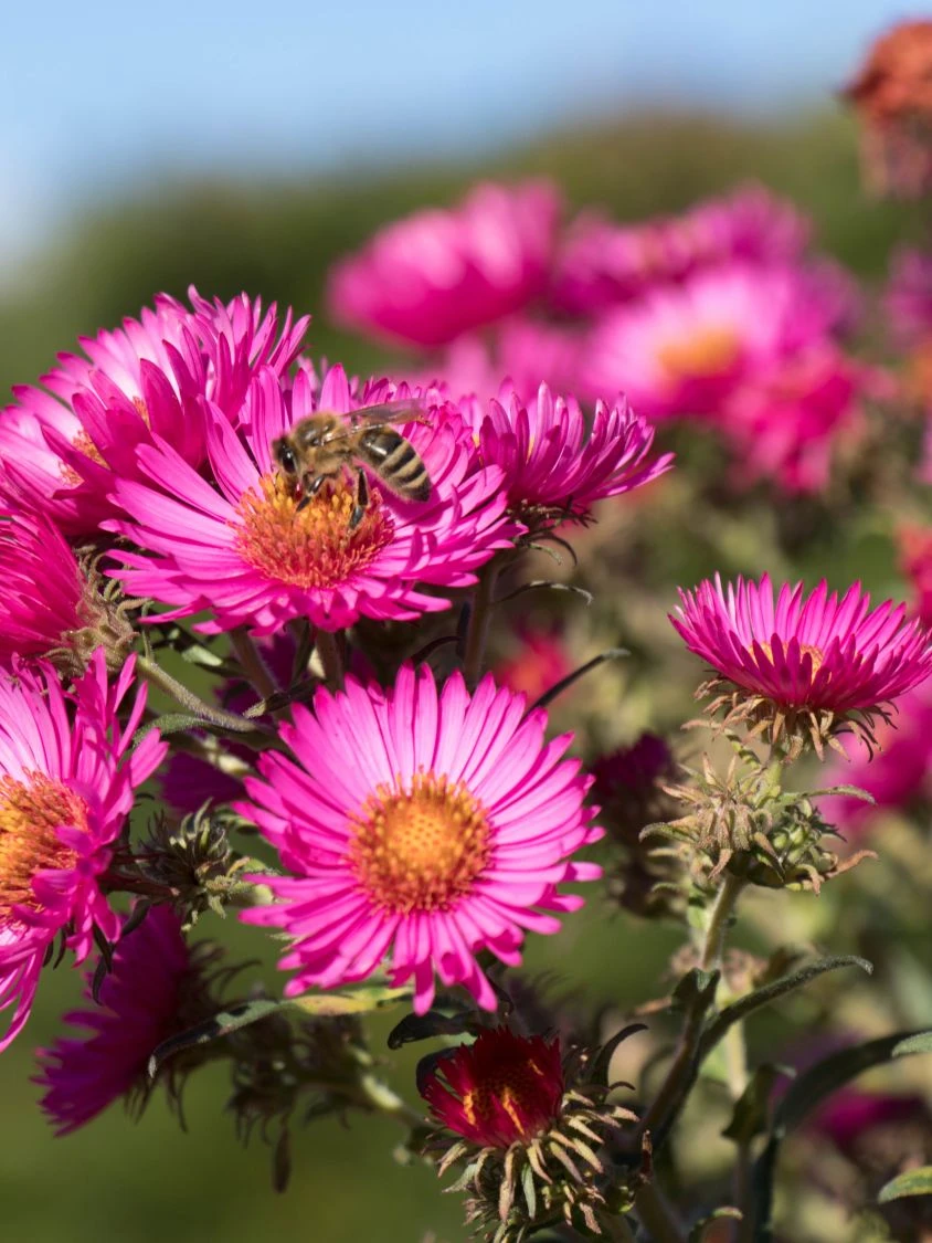 Doch diese Pflanze ist nicht nur zum anschauen, sie erfüllt auch einen mehr als praktischen Nutzen. Denn gerade der Oktober ist eine der größten Sammelzeiten für Bienenvölker, die sich einen so großen Leckerbissen garantiert nicht entgehen lassen wollen. Fans der Bienenzucht aber auch jene die in den Genuss eines der Imkerei fähigen Wildbienen-Stocks sind ist deswegen die ‚Lachsglut‘ eine unumgängliche Zuchtpflanze, garantiert sie doch den fleißigen Bienen Nahrung in den letzten Monaten des Sommers. Und wer sich an Bienen in seinem Garten nicht erfreuen kann sei hier beruhigt: auch wenn die Aster novae-angliae ‚Lachsglut‘ stärker duftet ist sie doch nicht zwangsläufig ein Magnet für ganze Bienenvölker.