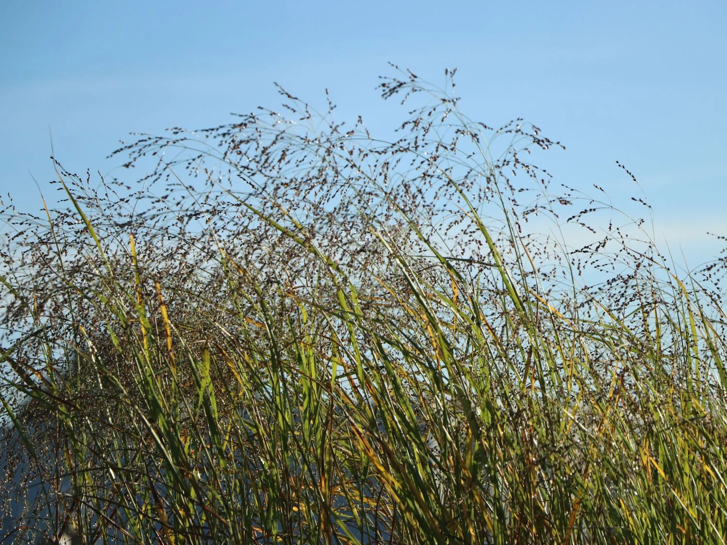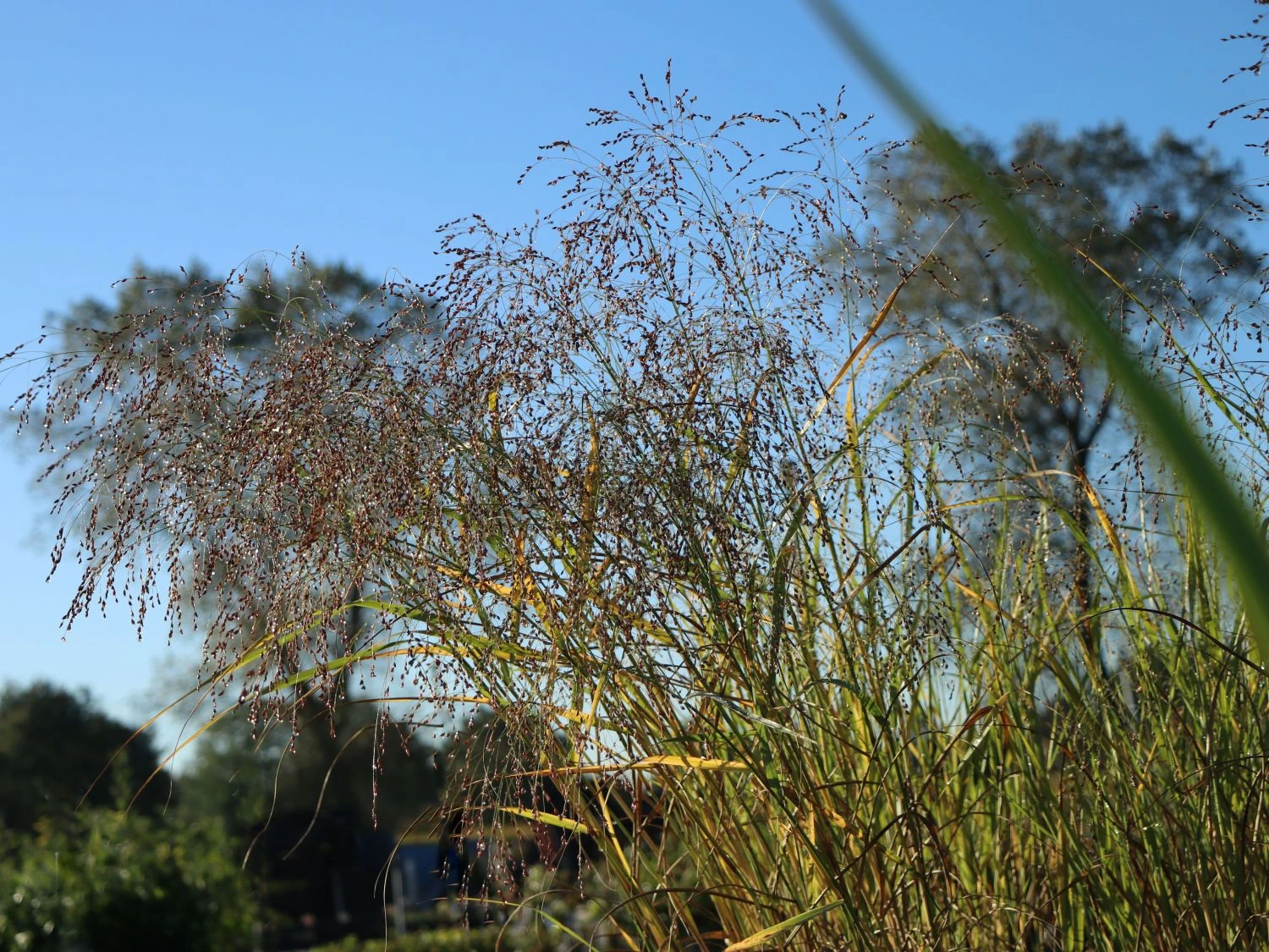 Die Ruten Hirse ‚Prairie Sky‘ ist ein attraktives und kompaktes Gras mit herrlichen blaugrünen Halmen. (Bot.) Panicum virgatum ‚Prairie Sky‘ ist ein sehr beliebtes Gras, das das ganze Jahr über bis in den Herbst hinein mit seinen schleierartigen Blütenständen ein Blickfang ist. Die ursprüngliche Rutenhirse stammt aus den mittleren und östlichen Teilen Nordamerikas und ist fester Bestandteil der dort vorherrschenden Prärie. Panicum virgatum ‚Prairie Sky‘ ist eine besondere Züchtung, die den Namen mit ihren intensiven blaugrünen Halmen und den zuerst zartrosa Rispen wirklich verdient. Die großen Rispen der Ruten Hirse ‚Prairie Sky‘ färben sich schnell braun und zeigen bis in den Winter einen ansehnlichen Fruchtschmuck. Im Herbst verfärbt sich das Laub in ein leuchtendes Gelb. In großflächig angelegten Beeten oder auf Freiflächen ist diese schöne Staude ein fantastischer Anblick.