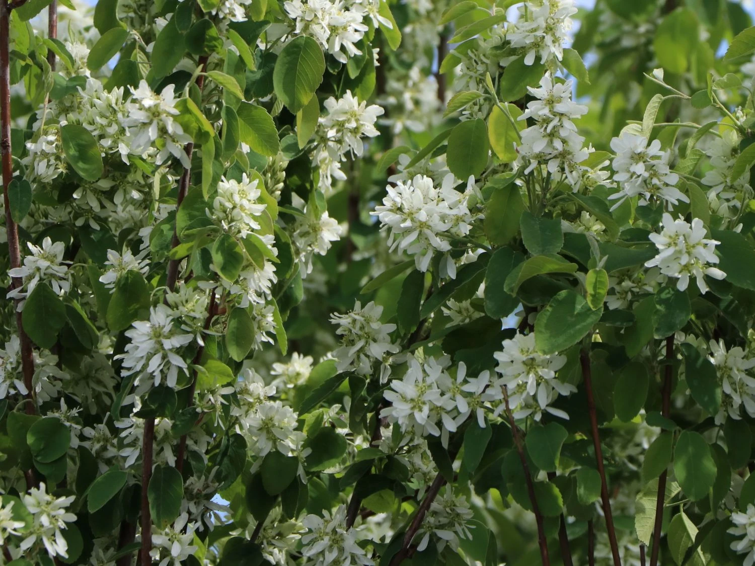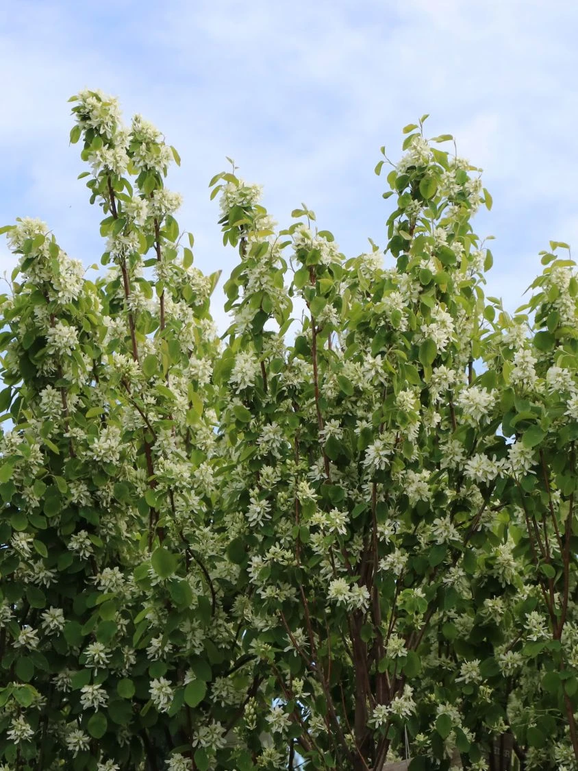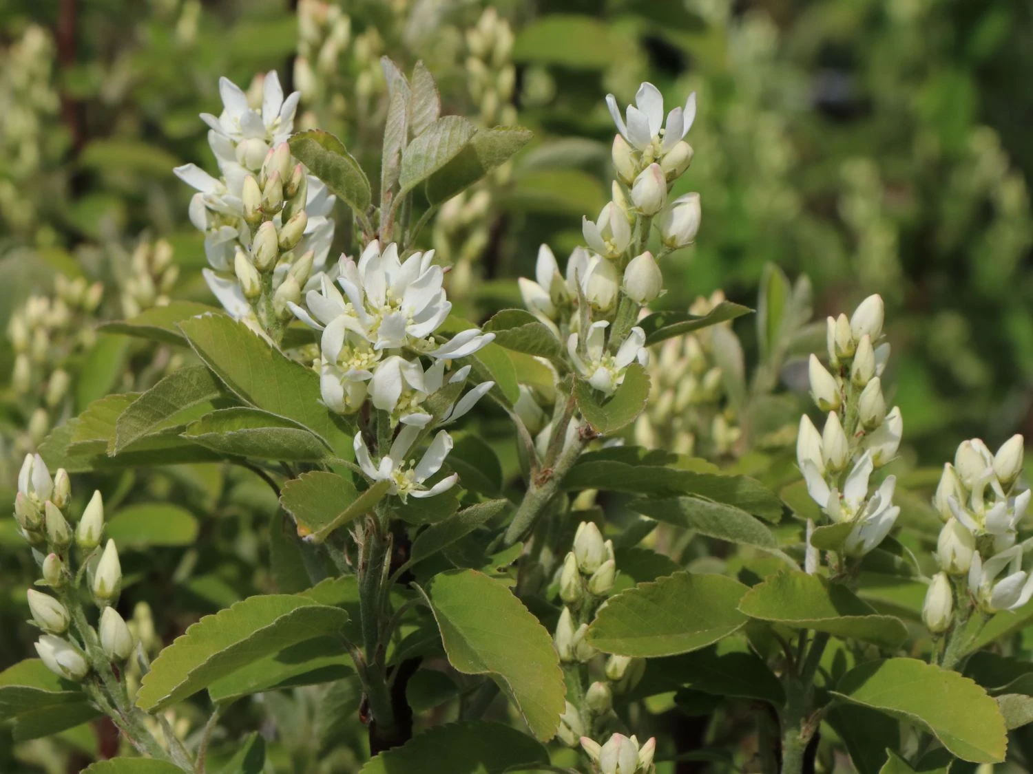 Die traubenförmigen Blüten erscheinen im April und Mai. Ab dem Sommer reifen die Früchte heran. Diese sind im Anfang rot, später dunkelviolett und bis zur Reife bläulich schwarz gefärbt. Die Früchte reifen nicht gleichzeitig. Nur die dunklen Felsenbirnen sind reif für die Ernte. Im Herbst erfreut den Betrachter der Anblick herbstlich gefärbter Blätter. Das Farbspektrum reicht von leuchtendem Gelb bis Rot. Amelanchier alnifolia ‚Obelisk‘ hebt sich ab und erweist sich als Farbtupfer. Die Säulen Felsenbirne ‚Obelisk‘ gehört zur Gattung der Felsenbirnen in der Familie der Rosengewächse. Amelanchier, abgeleitet von der Bezeichnung amelanche, bedeutet Äpfelchen. Tatsächlich sehen die Früchte bei genauerer Betrachtung wie kleine Äpfel aus. Züchtungen sind aus der Urform Amelanchier alnifolia hervorgegangen. Dank besserer Eigenschaften, erfreut sich das Ziergehölz hierzulande einer stetig größer werdenden Bekanntheit und Beliebtheit. Amelanchier alnifolia ‚Obelisk‘, auch Erlenblättrige Felsenbirne genannt, ist robust und leicht zu pflegen. Der Strauch benötigt einen sonnigen bis halbschattigen Standort im Garten. Der Boden soll locker, durchlässig und mäßig feucht sein. Die Säulen Felsenbirne ‚Obelisk‘ kann in Einzelstellung oder Gruppen stehen. Ein Pflanzabstand von mindestens einem Meter ist bei einer Gruppenpflanzung einzuhalten. Die Düngung im Frühjahr erfolgt mit Volldünger. Eine Alternative zum Kunstdünger ist natürlicher Kompost. Ein Rückschnitt ist bei diesem säulenförmigen Wuchs nur in Ausnahmen nötig, dann ist das Frühjahr zu empfehlen. Das Obstgehölz ist frosthart. Die heidelbeergroßen Früchte der Amelanchier alnifolia ‚Obelisk‘ haben einen fruchtig süßen und aromatischen Geschmack, der an Heidelbeeren erinnert. Sie sind roh essbar und direkt vom Strauch zu pflücken und zu verzehren. Die zahlreichen Blüten sind eine beliebte Nahrungsquelle für Bienen und andere Insekten. Die Früchte locken Vögel, wie Amsel, Star und Fink in den heimischen Garten. Diese zu beobachten, macht täglich eine große Freude. Bei reicher Ernte lassen sich die Früchte zu Konfitüre, Kompott, Saft und Wein verarbeiten. Die Beerenfrüchte, die eine Fülle an Vitaminen und Mineralstoffen enthalten, machen sich gut mit anderen Früchten im Obstsalat, dem Müsli oder dem Joghurt. Die Felsenbirnen sind als fruchtiger Kuchenbelag oder zum Backen von Muffins oder Crumbles mit Beerenobst wie Johannisbeeren zu verwenden. Der Fantasie sind keine Grenzen gesetzt.