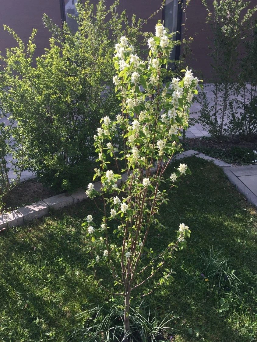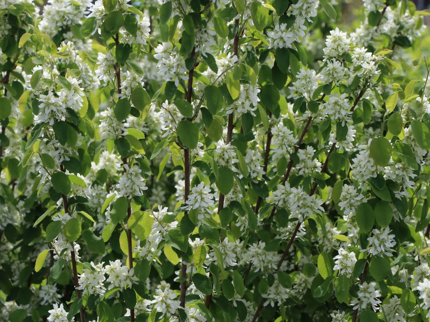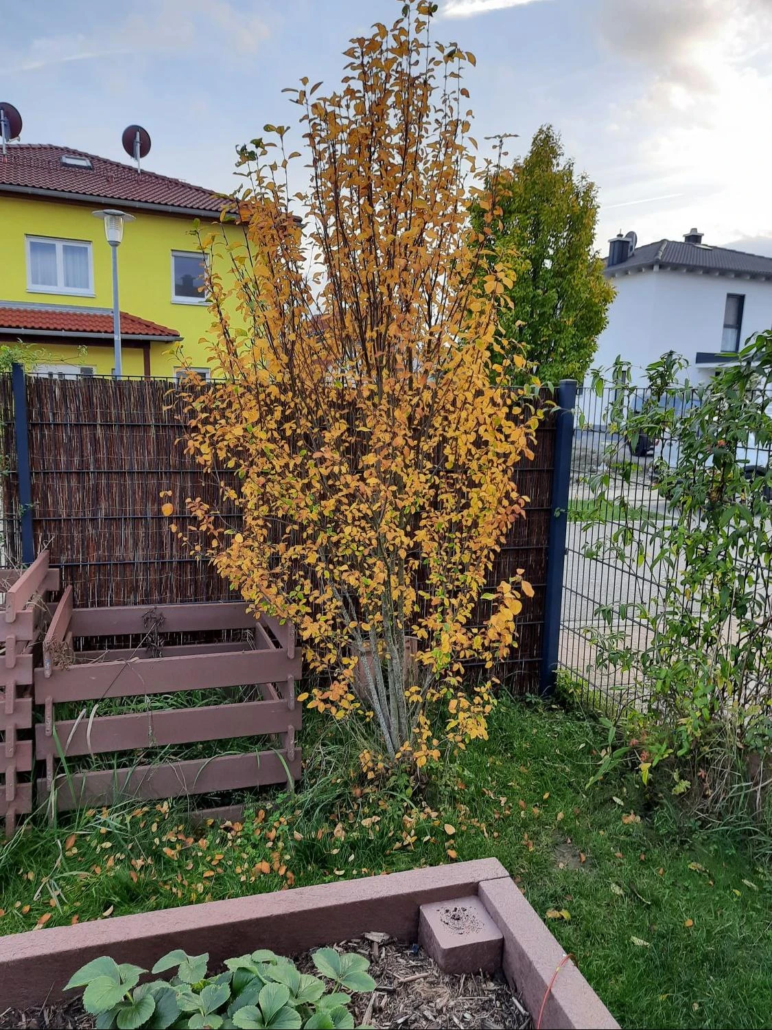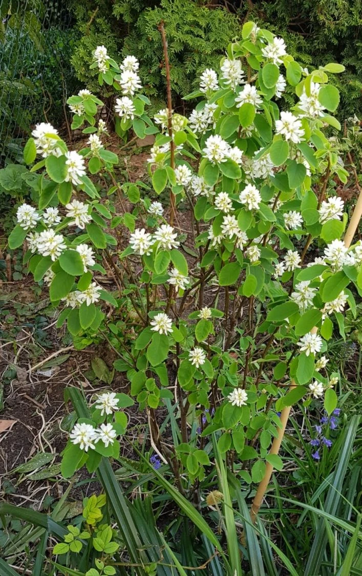 Die traubenförmigen Blüten erscheinen im April und Mai. Ab dem Sommer reifen die Früchte heran. Diese sind im Anfang rot, später dunkelviolett und bis zur Reife bläulich schwarz gefärbt. Die Früchte reifen nicht gleichzeitig. Nur die dunklen Felsenbirnen sind reif für die Ernte. Im Herbst erfreut den Betrachter der Anblick herbstlich gefärbter Blätter. Das Farbspektrum reicht von leuchtendem Gelb bis Rot. Amelanchier alnifolia ‚Obelisk‘ hebt sich ab und erweist sich als Farbtupfer. Die Säulen Felsenbirne ‚Obelisk‘ gehört zur Gattung der Felsenbirnen in der Familie der Rosengewächse. Amelanchier, abgeleitet von der Bezeichnung amelanche, bedeutet Äpfelchen. Tatsächlich sehen die Früchte bei genauerer Betrachtung wie kleine Äpfel aus. Züchtungen sind aus der Urform Amelanchier alnifolia hervorgegangen. Dank besserer Eigenschaften, erfreut sich das Ziergehölz hierzulande einer stetig größer werdenden Bekanntheit und Beliebtheit. Amelanchier alnifolia ‚Obelisk‘, auch Erlenblättrige Felsenbirne genannt, ist robust und leicht zu pflegen. Der Strauch benötigt einen sonnigen bis halbschattigen Standort im Garten. Der Boden soll locker, durchlässig und mäßig feucht sein. Die Säulen Felsenbirne ‚Obelisk‘ kann in Einzelstellung oder Gruppen stehen. Ein Pflanzabstand von mindestens einem Meter ist bei einer Gruppenpflanzung einzuhalten. Die Düngung im Frühjahr erfolgt mit Volldünger. Eine Alternative zum Kunstdünger ist natürlicher Kompost. Ein Rückschnitt ist bei diesem säulenförmigen Wuchs nur in Ausnahmen nötig, dann ist das Frühjahr zu empfehlen. Das Obstgehölz ist frosthart. Die heidelbeergroßen Früchte der Amelanchier alnifolia ‚Obelisk‘ haben einen fruchtig süßen und aromatischen Geschmack, der an Heidelbeeren erinnert. Sie sind roh essbar und direkt vom Strauch zu pflücken und zu verzehren. Die zahlreichen Blüten sind eine beliebte Nahrungsquelle für Bienen und andere Insekten. Die Früchte locken Vögel, wie Amsel, Star und Fink in den heimischen Garten. Diese zu beobachten, macht täglich eine große Freude. Bei reicher Ernte lassen sich die Früchte zu Konfitüre, Kompott, Saft und Wein verarbeiten. Die Beerenfrüchte, die eine Fülle an Vitaminen und Mineralstoffen enthalten, machen sich gut mit anderen Früchten im Obstsalat, dem Müsli oder dem Joghurt. Die Felsenbirnen sind als fruchtiger Kuchenbelag oder zum Backen von Muffins oder Crumbles mit Beerenobst wie Johannisbeeren zu verwenden. Der Fantasie sind keine Grenzen gesetzt.