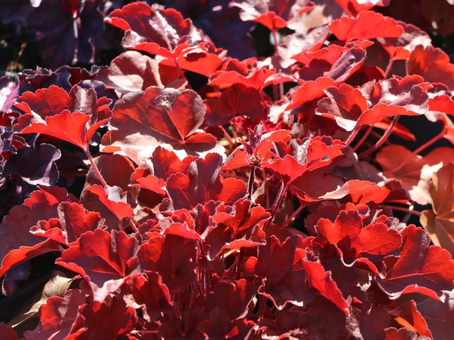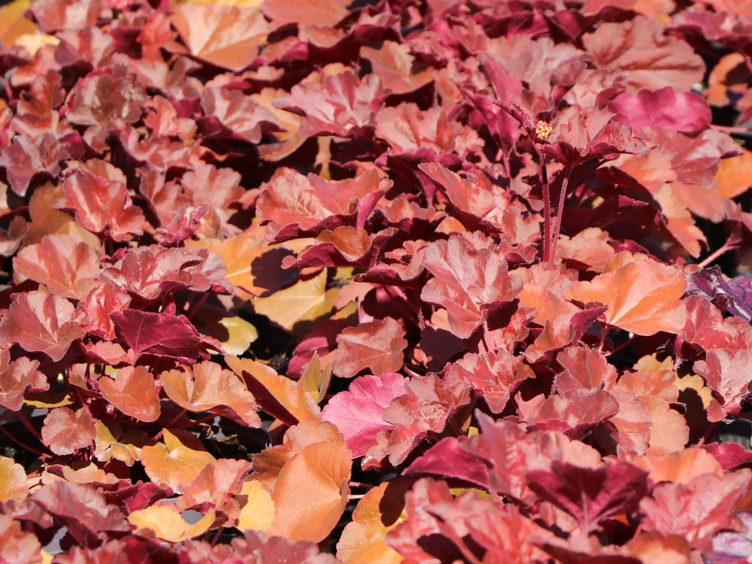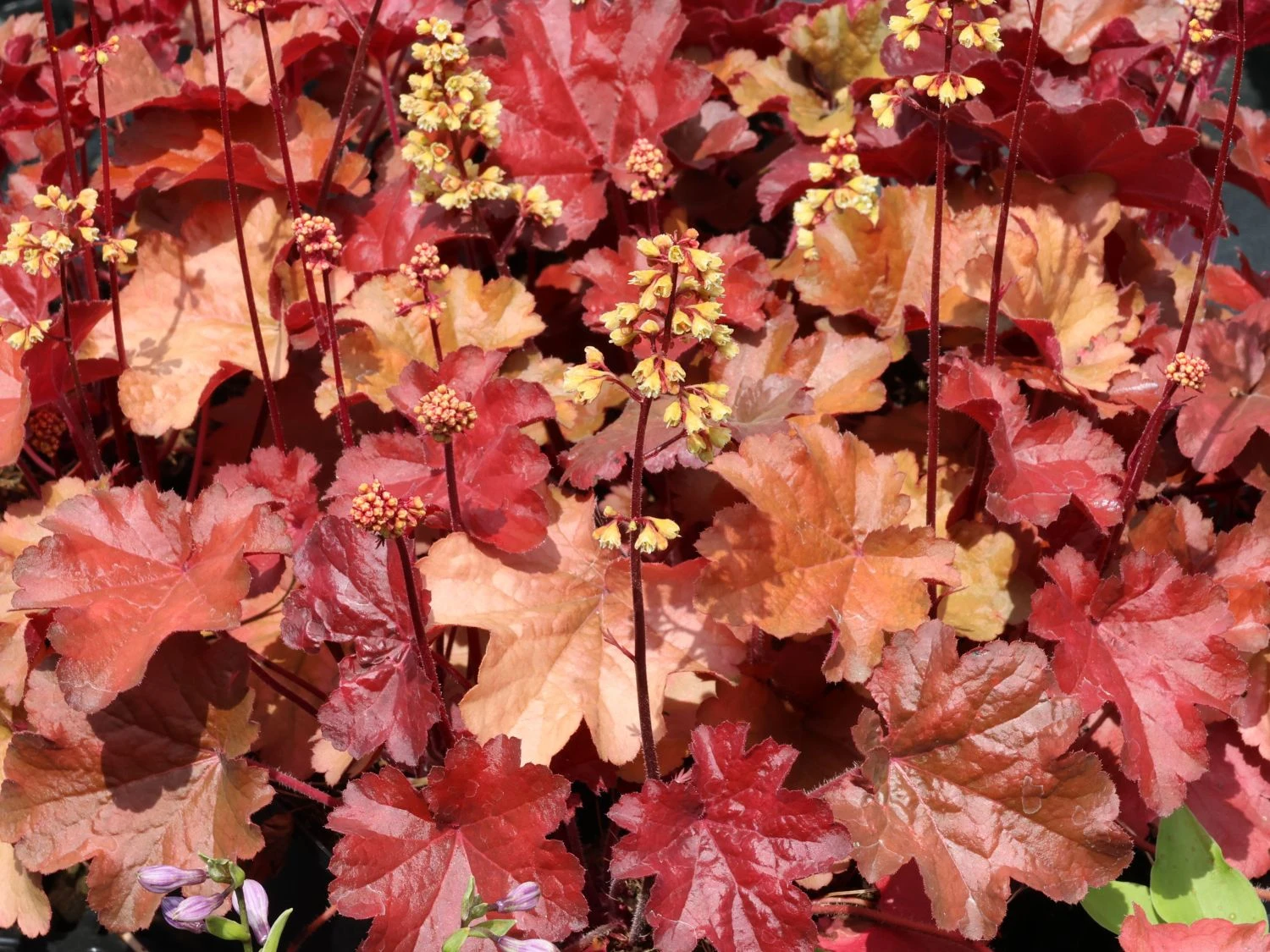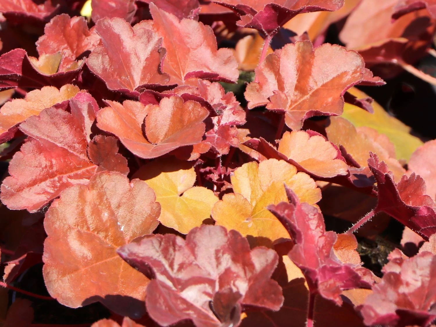 Das Samthaarige Silberglöckchen ‚Little Cuties Blondie‘ ist eine auffällige neue Heuchera-Sorte. Die mehrjährige (bot.) Heuchera villosa ‚Little Cuties Blondie‘ präsentiert von Juli bis August ihre karamellfarbenen Blütenrispen. Die Pflanze begeistert jeden Gärtner, auch wenn den Glöckchen keine Töne zu entlocken sind. Das Besondere sind nicht die Blüten, sondern die markanten Blätter. Die Blätter sind bei ‚Little Cuties Blondie‘ karamel, rot-braun und rot und silbrig angehaucht. Die Blätter wachsen an einem langen Stiel, sie sind rundlich und zeigen ein gelappten bis gekerbten Rand. Das neue Blattwerk treibt bereits früh im Jahr ab März aus und überdeckt mit der Zeit das wintergrüne Blattwerk. Die Blätter des Samthaarigen Silberglöckchens ‚Little Cuties Blondie‘ entfalten sich aus den bodenständigen Blatthorst. Die Adern sind auf der Blattoberfläche deutlich sichtbar. Die einfachen Blüten der Heuchera villosa ‚Little Cuties Blondie‘ bilden sich im Juli. Sie erheben sich bis in den August über dem Blätterkleid der schönen Staude. Sie sind karamellfarben und stehen in locker-verzweigten, rispigen Blütenständen. Diese Blattschmuckstaude wächst schnell und bedeckt im Nu halbschattige oder sonnige Stellen im Gartenbeet. Sie ist unkompliziert und bei eisigen Temperaturen von bis zu -23 Grad Celsius winterhart.