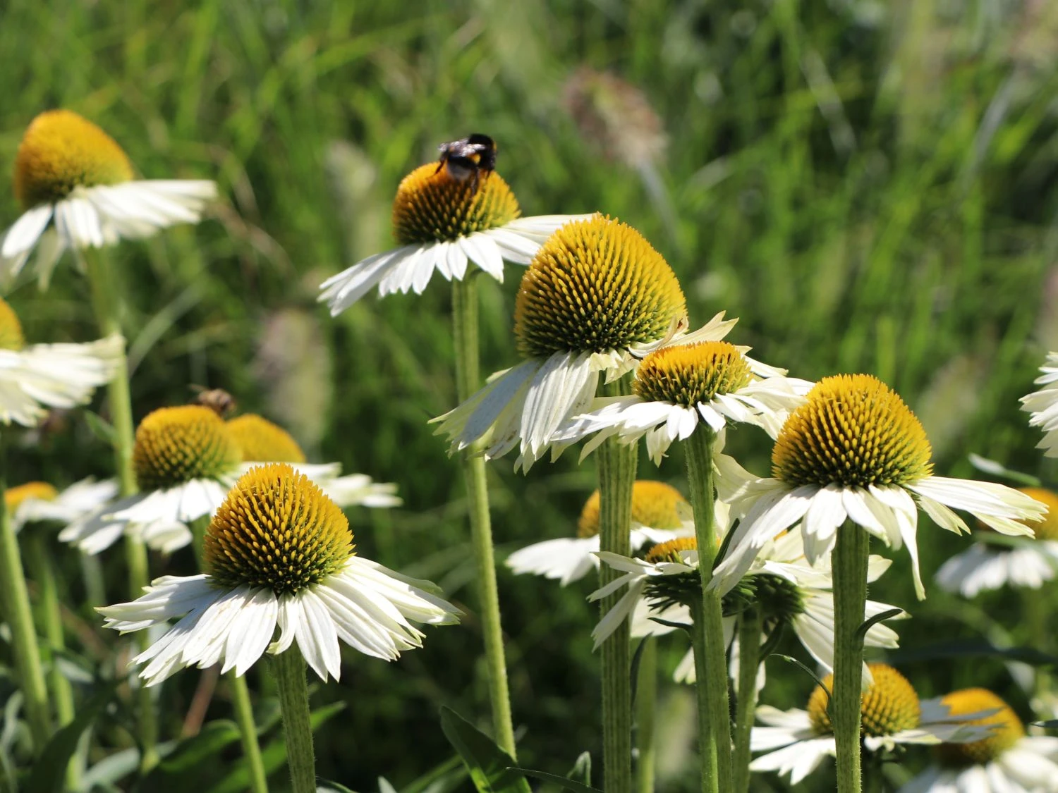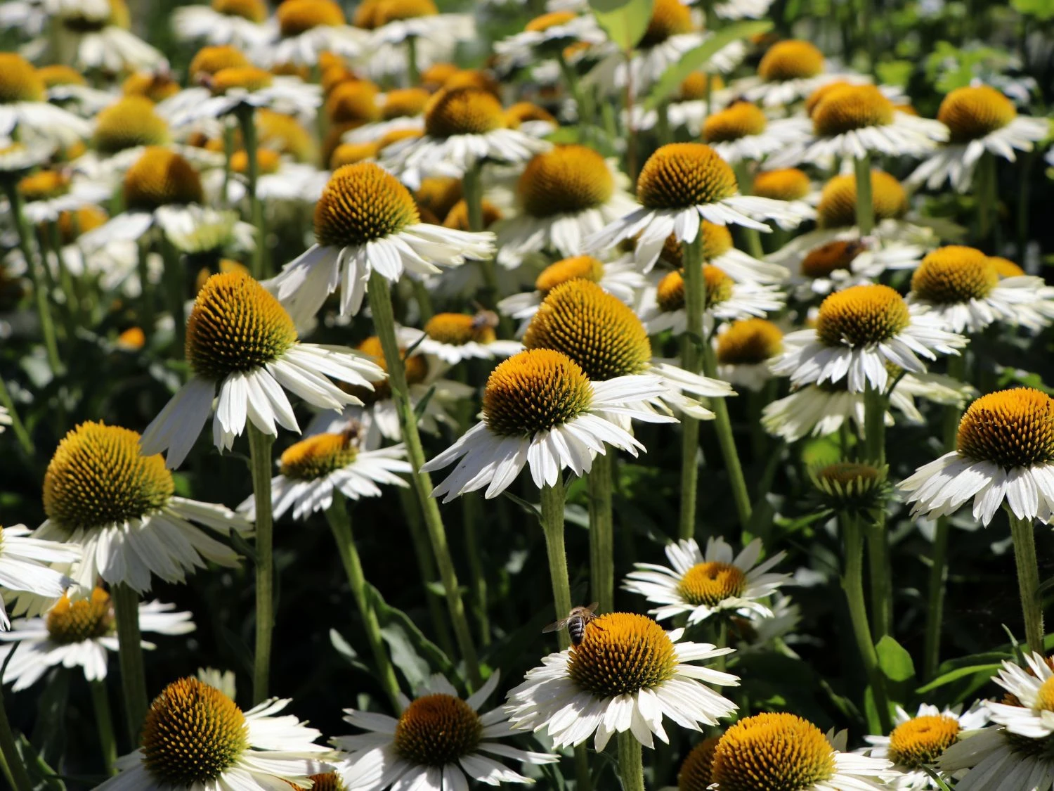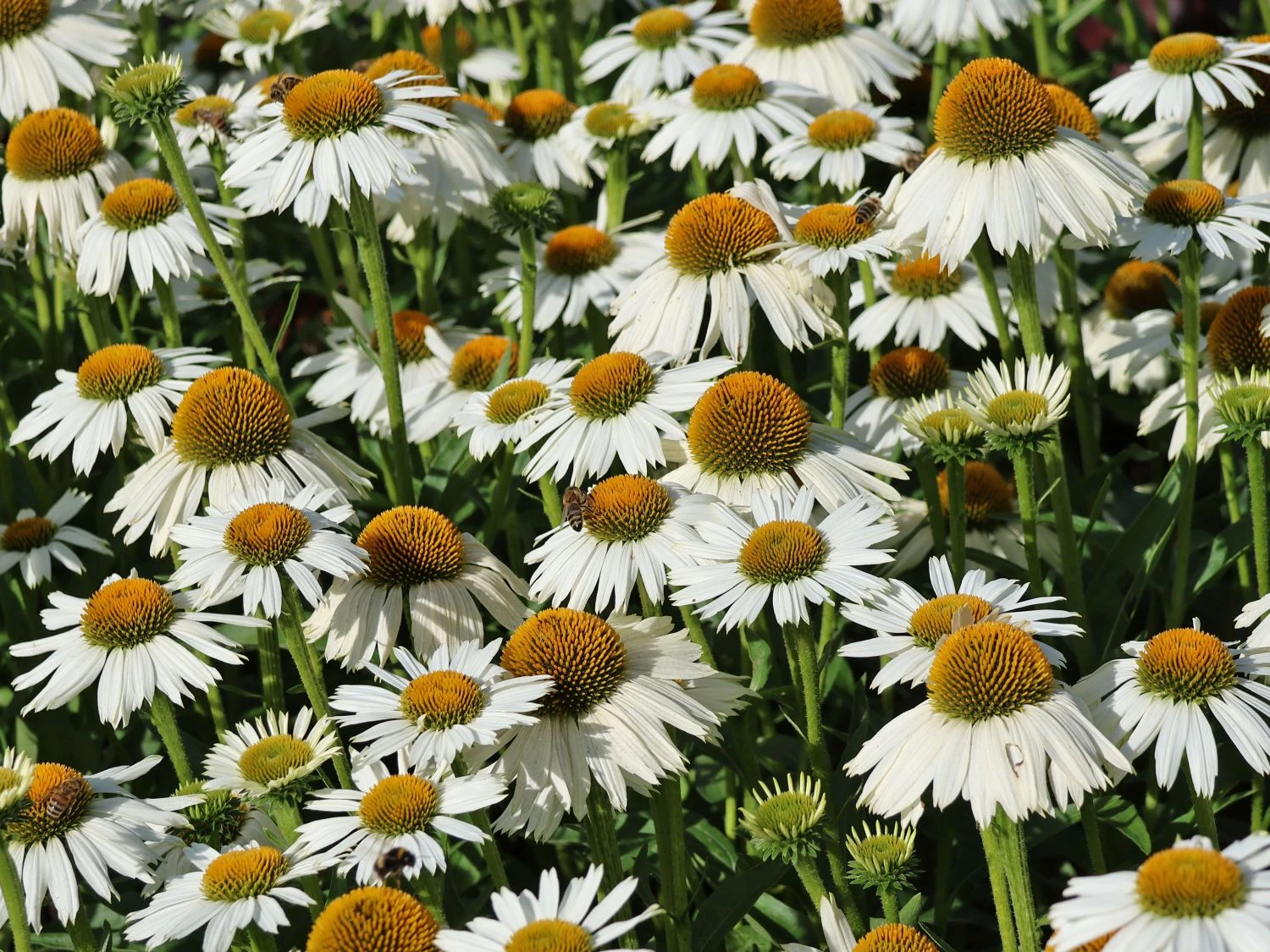 Der Scheinsonnenhut ‚White Meditation‘ ist eine zauberhafte Sorte mit einem verzweigten und kompakten Wuchs. Durch den reich verzweigten Wuchs zeigen sich sehr viele Blüten. Mit ihren strahlenförmigen, weißen Blütenblättern und der aufgewölbten Mitte präsentieren sich die großen Blütenköpfe. Unterstützt wird die Leuchtkraft der Blüten vom Scheinsonnenhut ‚White Meditation‘ von den dunkelgrünen, lanzettlichen Blättern, die als herrlicher Kontrast fungieren. In der Blühphase von Juli bis September zieht (bot.) Echinacea purpurea ‚White Meditation‘ eine ganze Schar von Bienen an. Die Insekten kommen gerne in den Garten und freuen sich an der wertvollen Nahrungsquelle, an der sie sich bedienen.