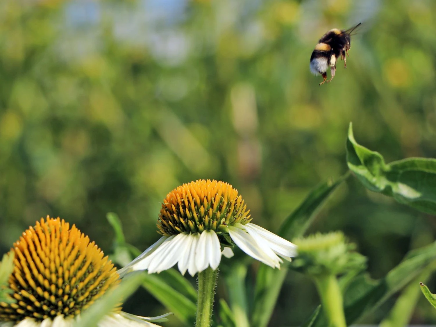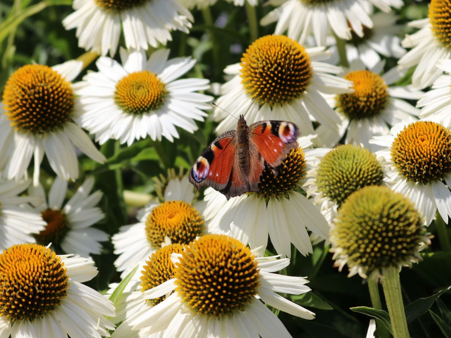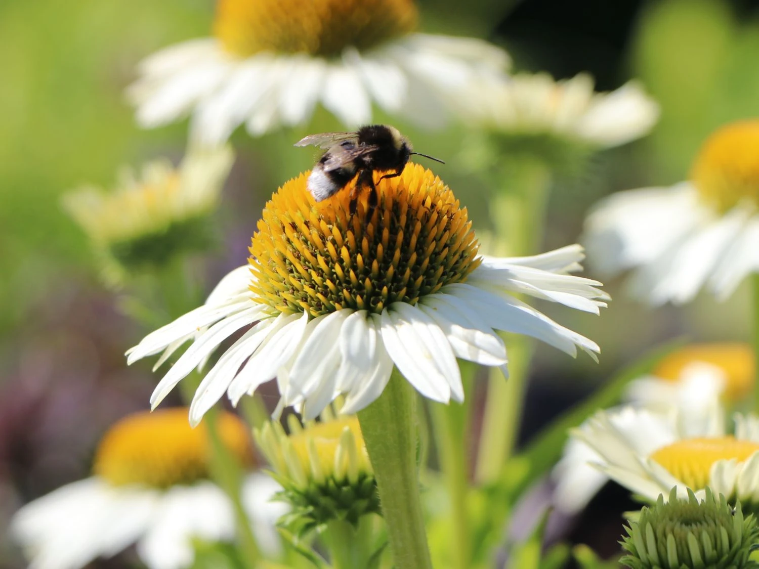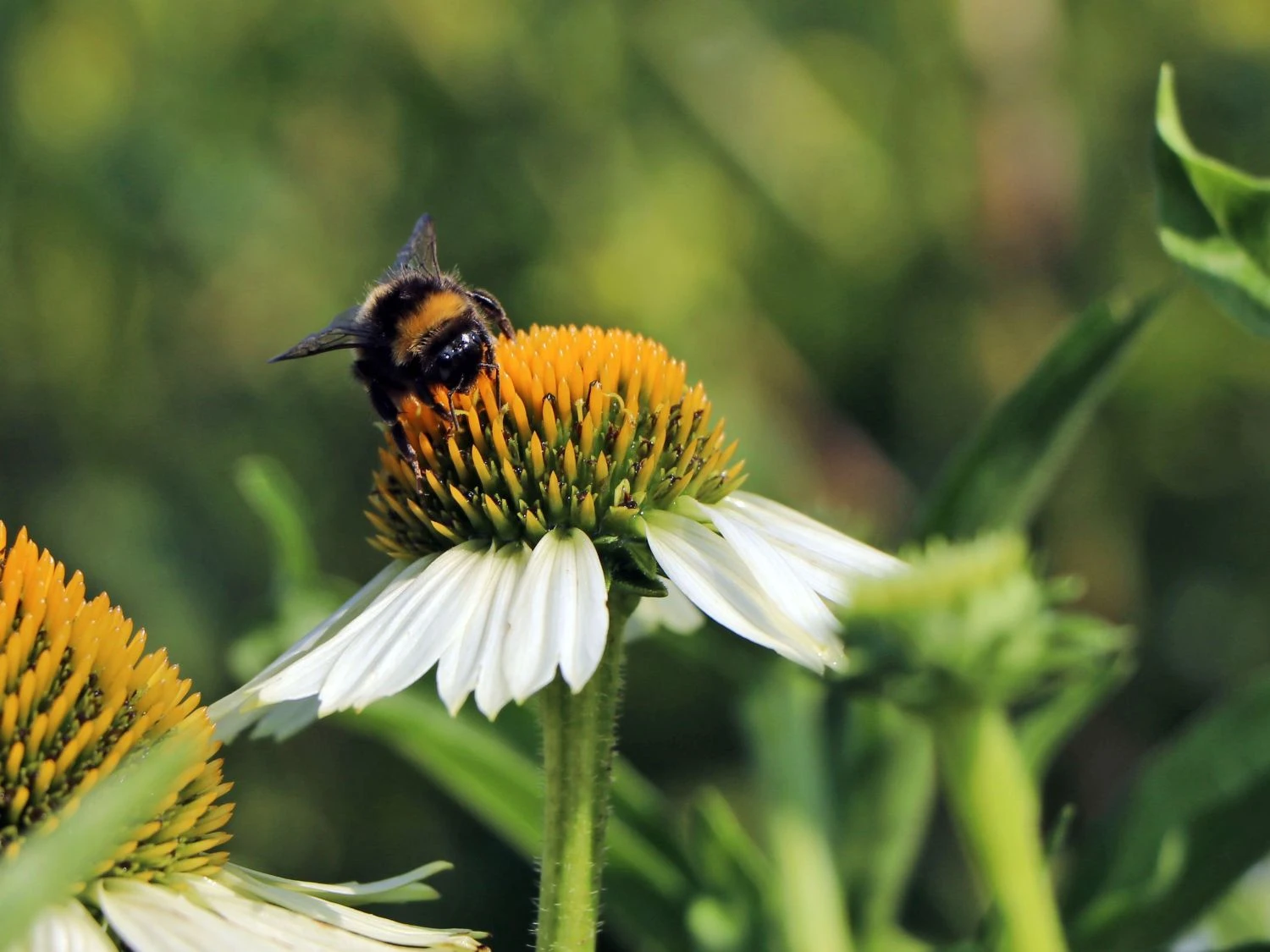 Der Scheinsonnenhut ‚White Meditation‘ ist eine zauberhafte Sorte mit einem verzweigten und kompakten Wuchs. Durch den reich verzweigten Wuchs zeigen sich sehr viele Blüten. Mit ihren strahlenförmigen, weißen Blütenblättern und der aufgewölbten Mitte präsentieren sich die großen Blütenköpfe. Unterstützt wird die Leuchtkraft der Blüten vom Scheinsonnenhut ‚White Meditation‘ von den dunkelgrünen, lanzettlichen Blättern, die als herrlicher Kontrast fungieren. In der Blühphase von Juli bis September zieht (bot.) Echinacea purpurea ‚White Meditation‘ eine ganze Schar von Bienen an. Die Insekten kommen gerne in den Garten und freuen sich an der wertvollen Nahrungsquelle, an der sie sich bedienen.