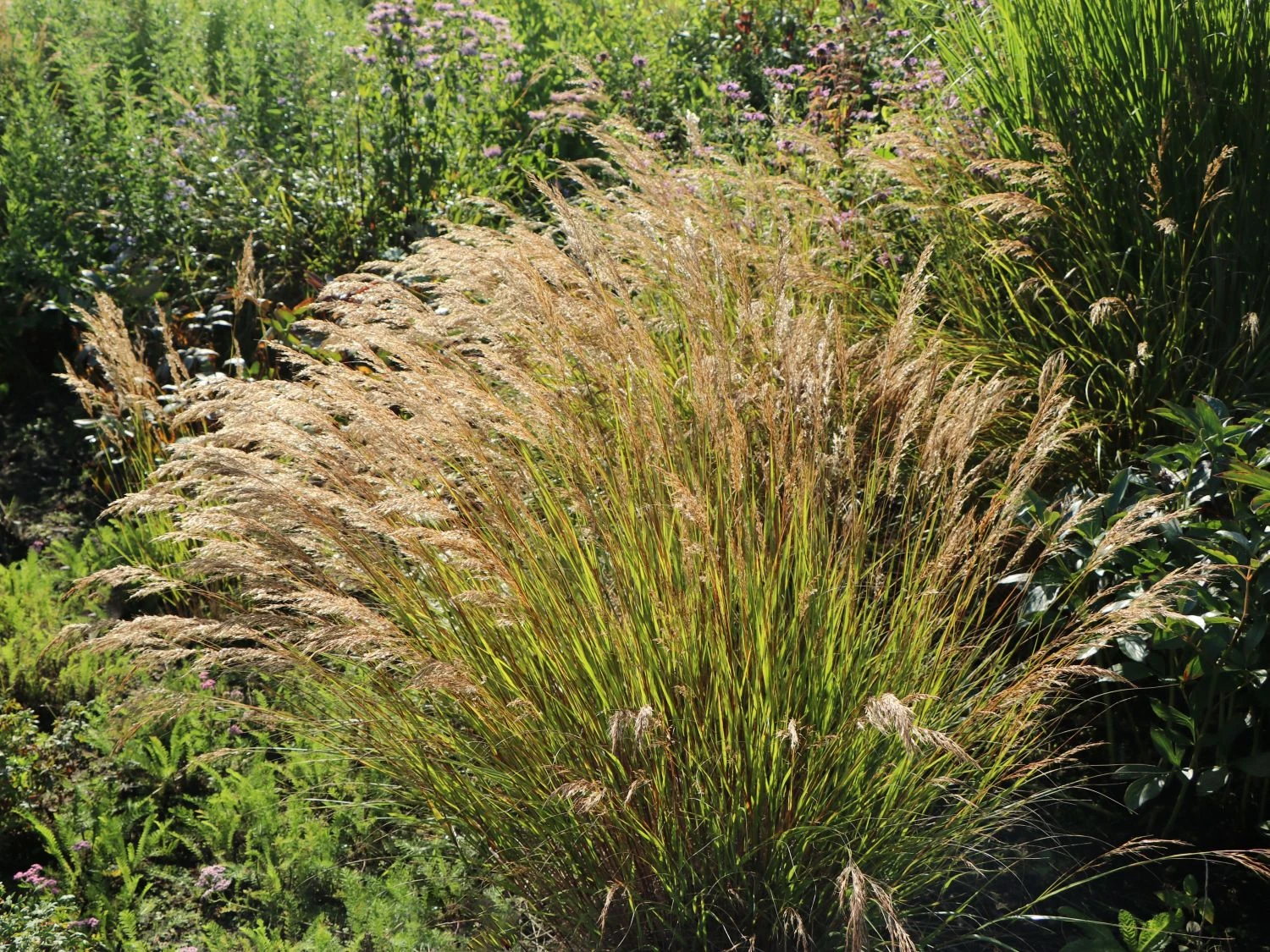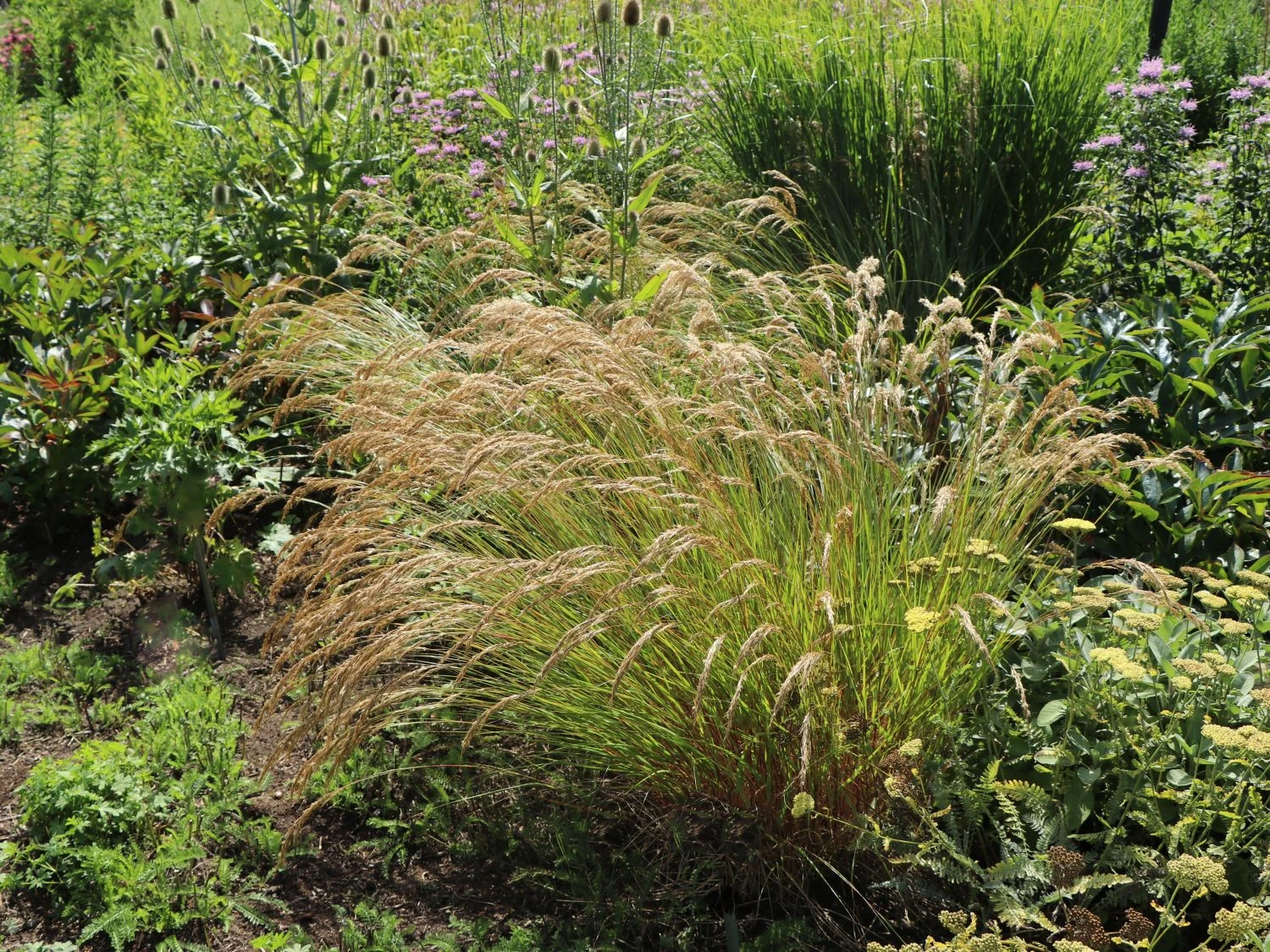Das Silberährengras ‚Algäu‘ zeichnet sich durch einen aufrechten, aber auch etwas geneigten und leicht bogig verlaufenden Wuchs aus. Die Blätter vom Silber-Raugras sind grün und lassen am Boden leicht rötlich gefärbte Blattansätze erkennen. Im Herbst färben sich die Blätter von Achnatherum calamagrostis ‚Algäu‘ in den kälteren Regionen gelblich bis gelblich-braun. In milden Wintern bleiben die Blätter des Silberährengrases ‚Algäu‘ wintergrün und präsentieren sich bis weit in die kalte Jahreszeit äußerst wirkungsvoll. Ein besonderes Kennzeichen des Silberährengrases ‚Algäu‘ ist seine imposante, rispenartige und sehr lang gestreckte Blüte. Sie zeigt sich in den Monaten Juli bis August und nimmt dann eine gelblich-braune Färbung an.