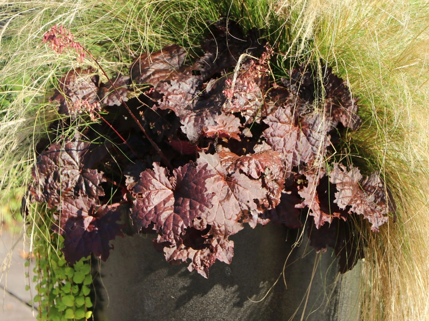 Der botanische Name Heuchera lässt sich auf Johann Heinrich von Heucher, einem deutschen Botaniker, zurückführen. Die Heuchera kommt ursprünglich aus Nordamerika, wo sie vorwiegend in Gebirgsregionen und in der Nähe von Ufern zu finden ist. Die Blätter und Blüten des Silberglöckchen ‚Cappuccino‘ bieten einen schönen Kontrast zu anderen Pflanzen. Die Staudenpflanze wird aus diesem Grund gerne zur Auflockerung von Blumenbeeten oder für Dekorationszwecke in der Floristik verwendet. Zur Flächendeckung reichen sieben bis acht Staudenpflanzen pro Quadratmeter aus. Die Blätter des Silberglöckchen ‚Cappuccino‘ beeindrucken durch ihr rundes Aussehen und die gekräuselten Blattränder. Ihre besondere Farbe zeigt sich in verschiedenen Farbnuancen von leicht purpur an der Blattunterseite bis rotbraun an der Blattoberseite. Allerdings vergrünen die Blätter bei tiefer Schattenlage. Während der Sommermonate Juli bis August bildet die Heuchera micrantha ‚Cappuccino‘ an dünnen Stielen eine Vielzahl winziger, rispenartiger Blüten. Die Farbe der glockenförmigen und einfachen Blüten reicht von weiß bis rosa.