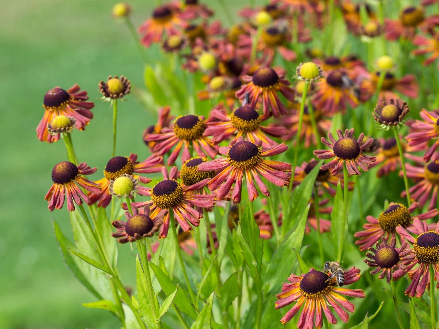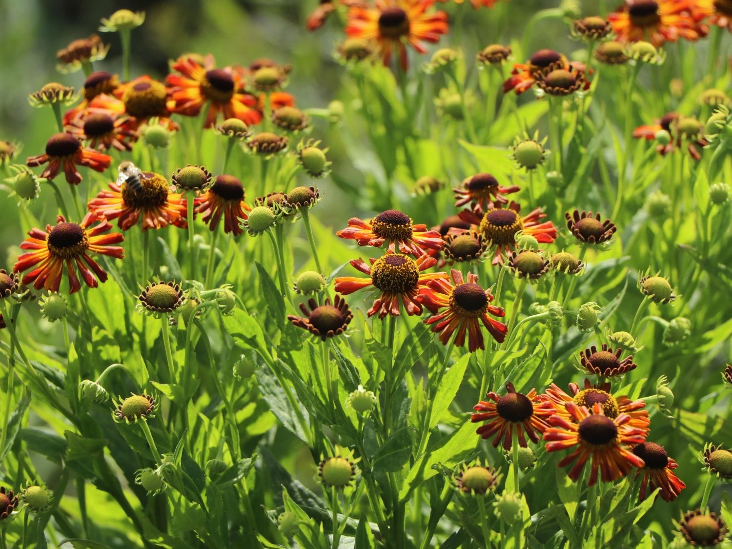 Die Sonnenbraut ‚Loysder Wieck‘ ist eine ganz bezaubernde und facettenreiche Pflanze für den heimischen Garten. Der Name Sonnenbraut ist sehr aussagefähig für diese Pflanzengattung, denn ihre Blütenköpfchen sehen aus wie kleine Sonnen. Es gibt viele Sorten der Gattung Helenium, aber die Sorte Helenium x cult. ‚Loysder Wieck‘ ist ein besonders schönes Beispiel für diese Pflanzenart. Auf großen Stängeln sitzen die leuchtenden Blüten, die in ihrer Größe zwischen 3,5 – 4,5 cm schwanken, aber in der Menge eben das Farbenmeer bilden.