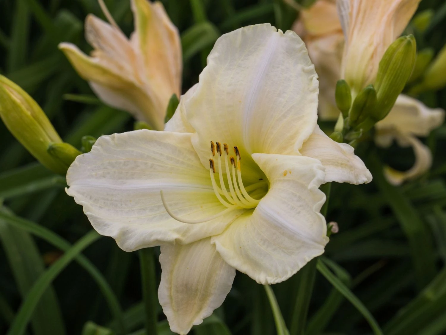 Für Liebhaber von weißen Taglilien ist die ‚White Temptation‘ eine ausgesprochen dankbare und schöne Blütenstaude, die in Kombination mit früh blühenden weißen Taglilien eine lange Blütezeit in Weiß garantieren. Die mittelgroßen weißen, schalenförmigen Blüten öffnen sich weit nach außen und geben ihren Blick auf eine leicht grüne Mitte und die Blütenstempel frei. Ebenfalls sind die Blütenblätter leicht gerüscht, was sie zudem noch ein wenig eleganter aussehen lässt.