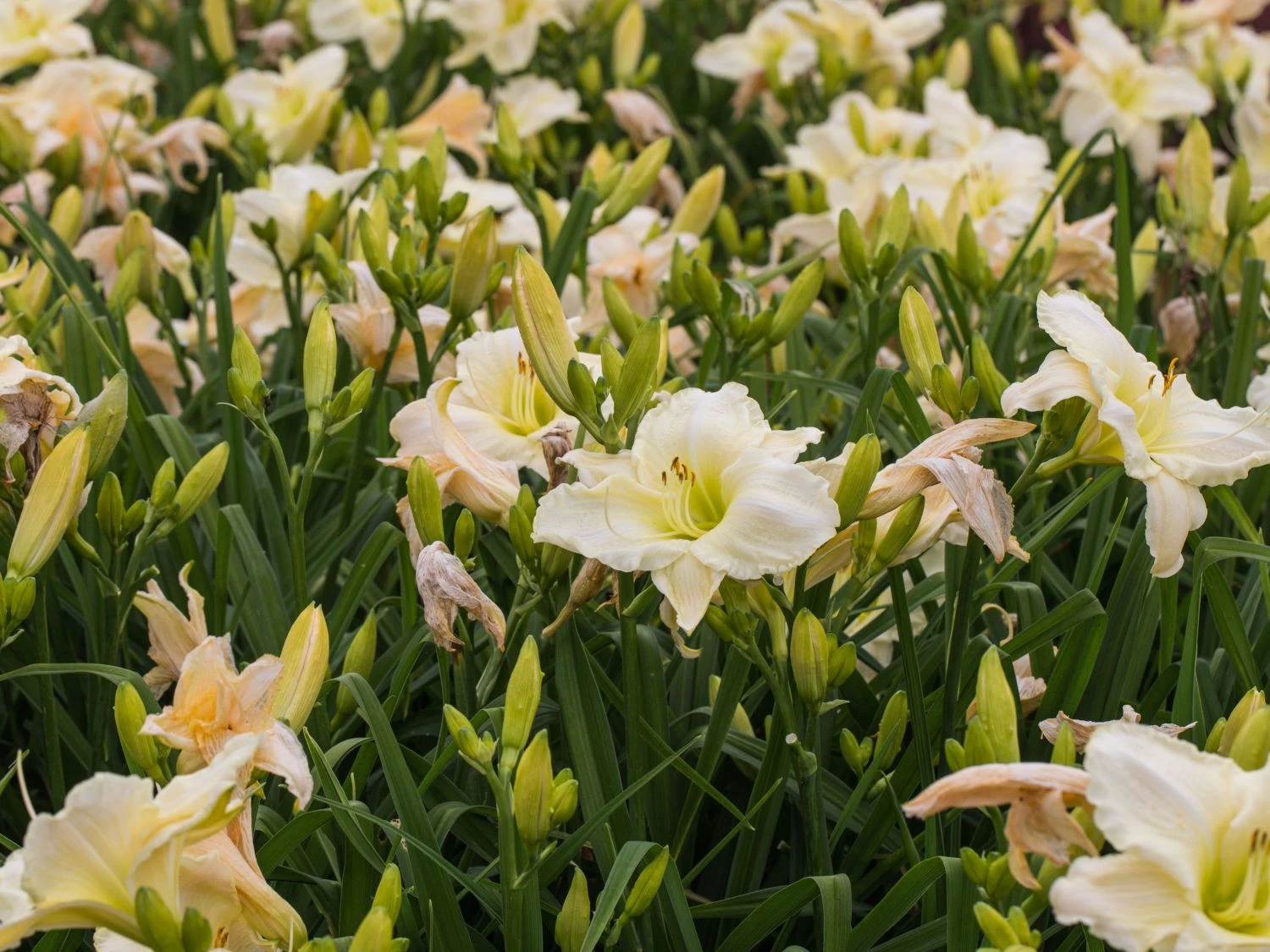 Die Taglilie ‚White Temptation‘ besticht durch ihr elegantes Aussehen und wie alle anderen Taglilien Sorten auch, durch den üppigen Wuchs, auch wenn er bei dieser Sorte erst spät im August einsetzt. Die vielen, sich weit öffnenden fast schneeweißen Blüten überzeugen jeden Gartenfreund Jahr für Jahr. Auch wenn sie, wie der Name Taglilie schon sagt, nur einen Tag blühen werden jeden Tag aufs Neue Blüten geöffnet, so dass in der Blütezeit von August bis September ein eindrucksvolles Schauspiel im Gartenbeet zu sehen ist. Mit einer Größe von bis zu 80 cm können mit einem Pflanzabstand von 50 cm, rund vier Pflanzen pro Quadratmeter gesetzt werden.