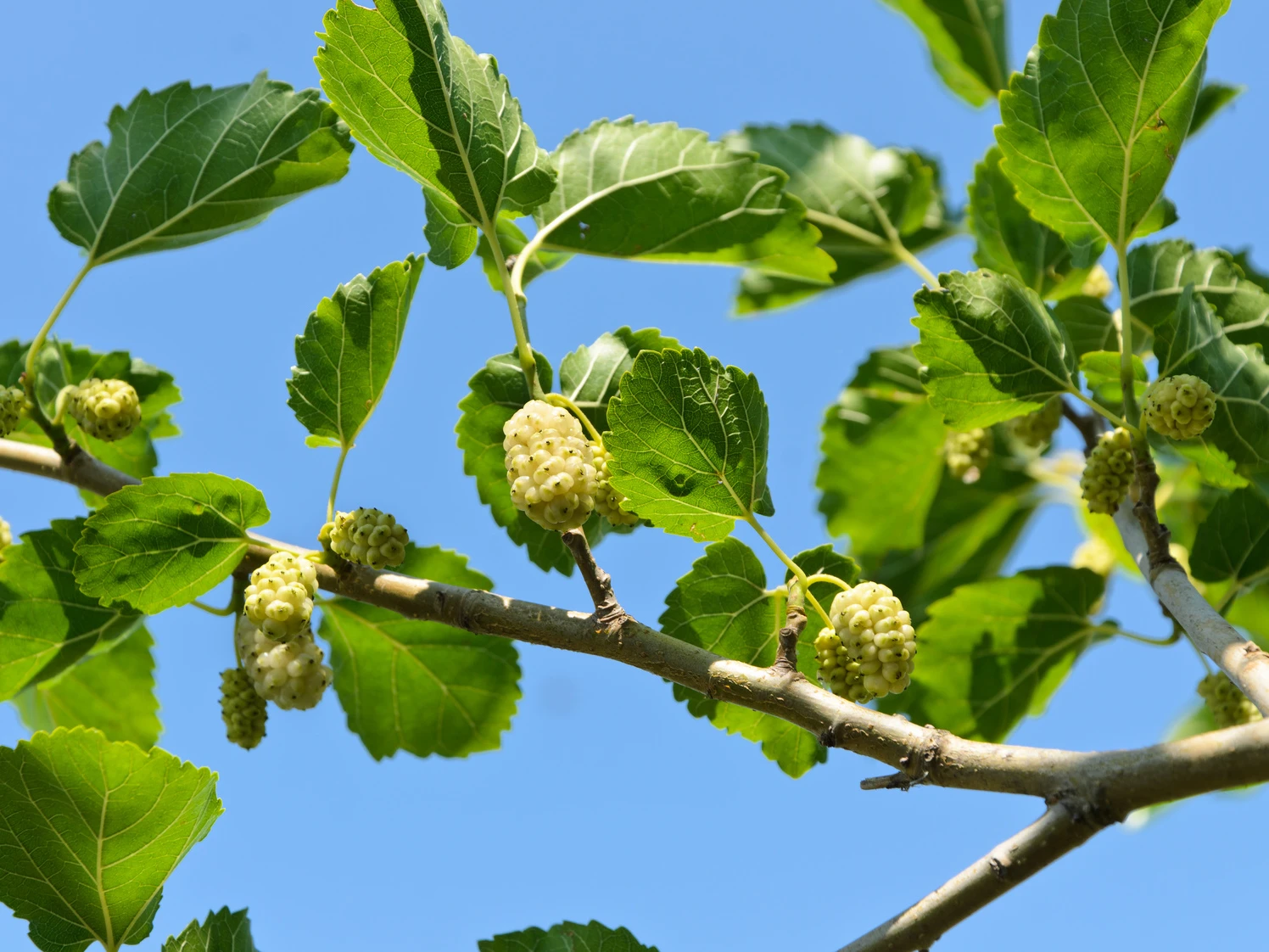 Die Weiße Maulbeere entwickelt Früchte, die wie längliche Brombeeren aussehen. Sie sind essbar, haben eine weiße, lila angehauchte bis schwarze Farbe und einen süßlichen Geschmack, der leicht fade wirken kann. Im Mai/Juni kommen die Blüten zum Vorschein, sie sind aber eher unscheinbar.