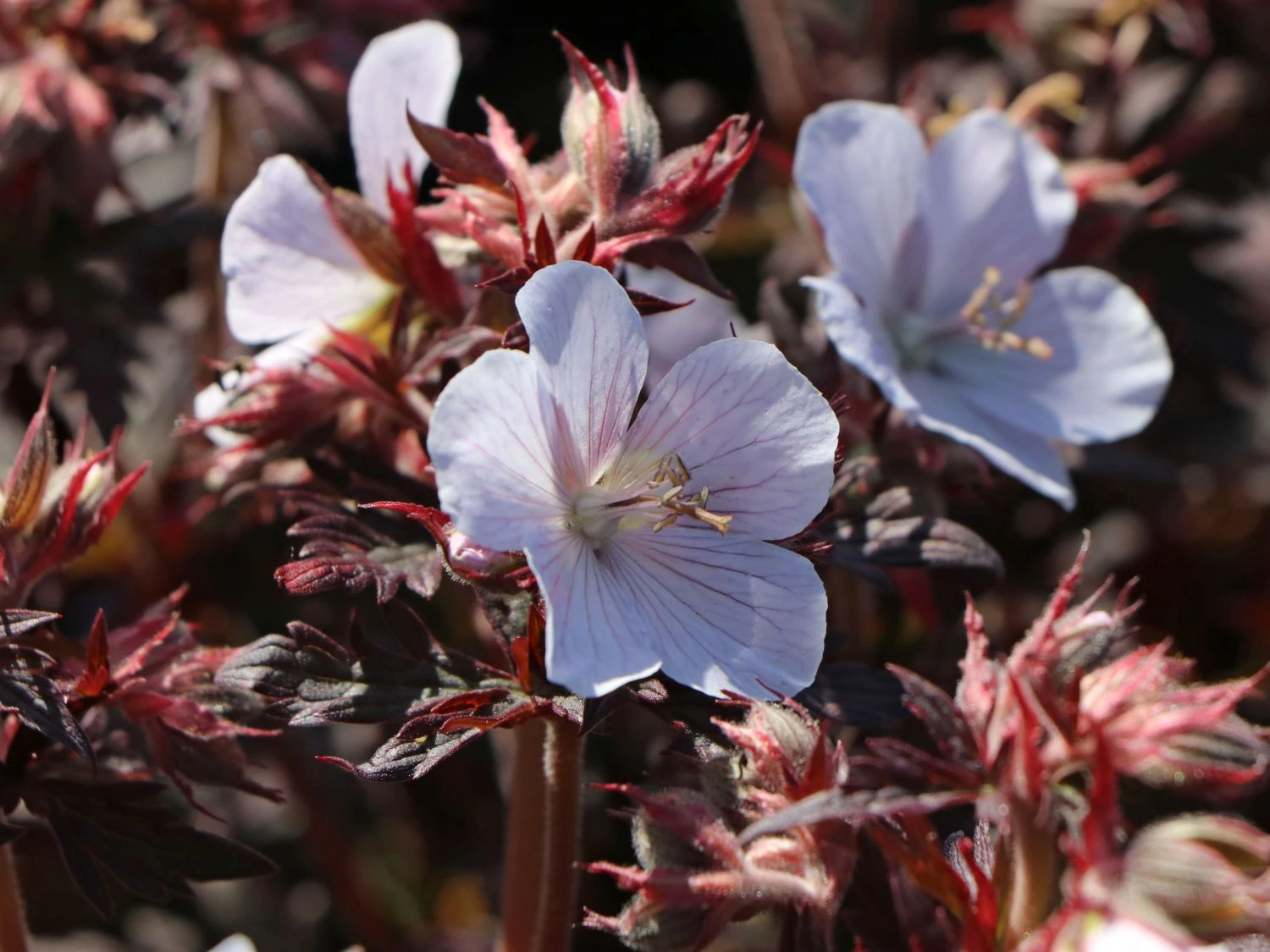 Der Wiesen-Storchschnabel ‚Black’n White Army‘ ist eine Sorte für alle, die das Besondere lieben. Diese Rarität zeigt in ein tolles Farbspiel und trägt nicht grundlos ihren Sortennamen. Mit weißen Blüten über dem dunklen burgunderroten Laub ist (bot.) Geranium pratense ‚Black’n White Army‘ ein Blickfang. Der Kontrast zwischen Blüte und Blatt ist bei diesem Storchschnabel wunderschön. Während der Blütezeit von Mai bis Juli überzieht die kräftig wachsende Pflanze den ihr zugedachten Standort im Garten mit der weißen Blütenfarbe. In der Mitte der Schalenblüten sitzt, wie hingehaucht, ein kleiner rosa Fleck. Fallen die Blätter der Blüten ab, bleibt das dekorative Laub zurück und bildet einen dunklen Laubteppich. Der Wiesen-Storchschnabel ‚Black’n White Army‘ liebt die Sonne und braucht für ein gutes Gedeihen Wärme. Auch im leichten Halbschatten entwickelt sich die aparte Pflanze gut. Den vollen Schatten verträgt Geranium pratense ‚Black’n White Army‘ nicht. Steht die Staude optimal, wächst sie auf bis zu 40 cm in der Höhe und Breite.